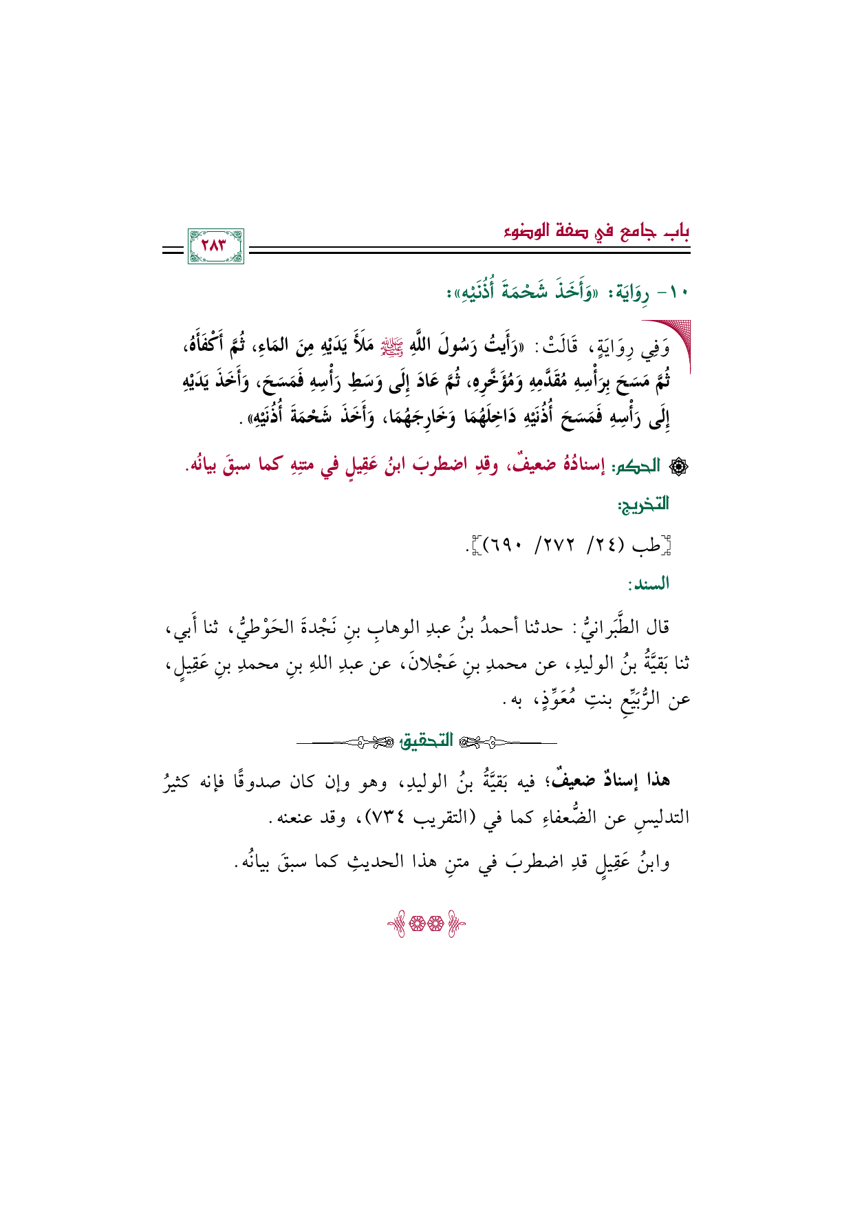 قال الطَّبَرانيُّ: حدثنا أحمدُ بنُ عبدِ الوهابِ بنِ نَجْدةَ الحَوْطيُّ، ثنا أَبي، ثنا بَقيَّةُ بنُ الوليدِ، عن محمدِ بنِ عَجْلانَ، عن عبدِ اللهِ بنِ محمدِ بنِ عَقِيلٍ، عن الرُّبَيِّعِ بنتِ مُعَوِّذٍ، به.