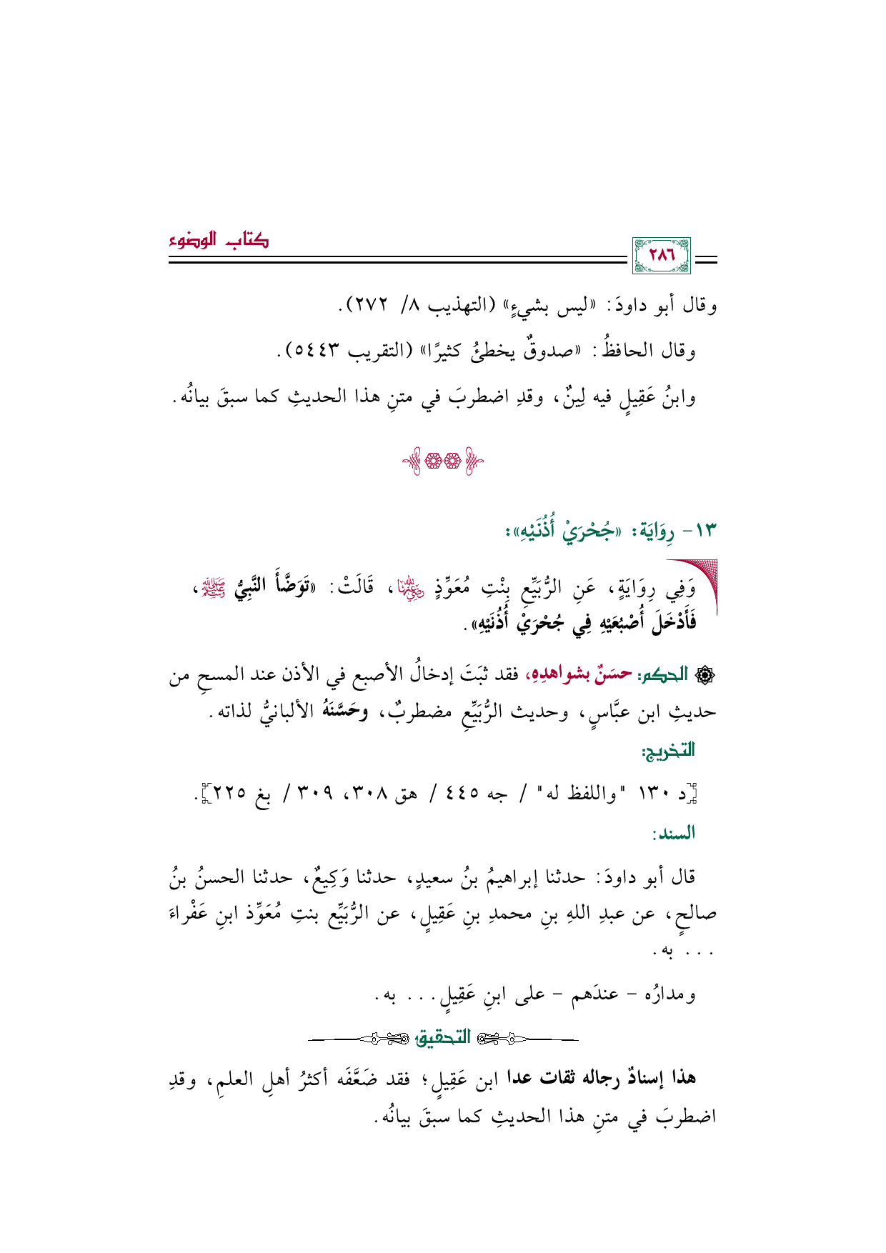 [الحكم]: حسَنٌ بشواهدِهِ، فقد ثبَتَ إدخالُ الأصبع في الأذن عند المسحِ من حديثِ ابن عبَّاسٍ، وحديث الرُّبَيِّعِ مضطربٌ، وحَسَّنَهُ الألبانيُّ لذاته.