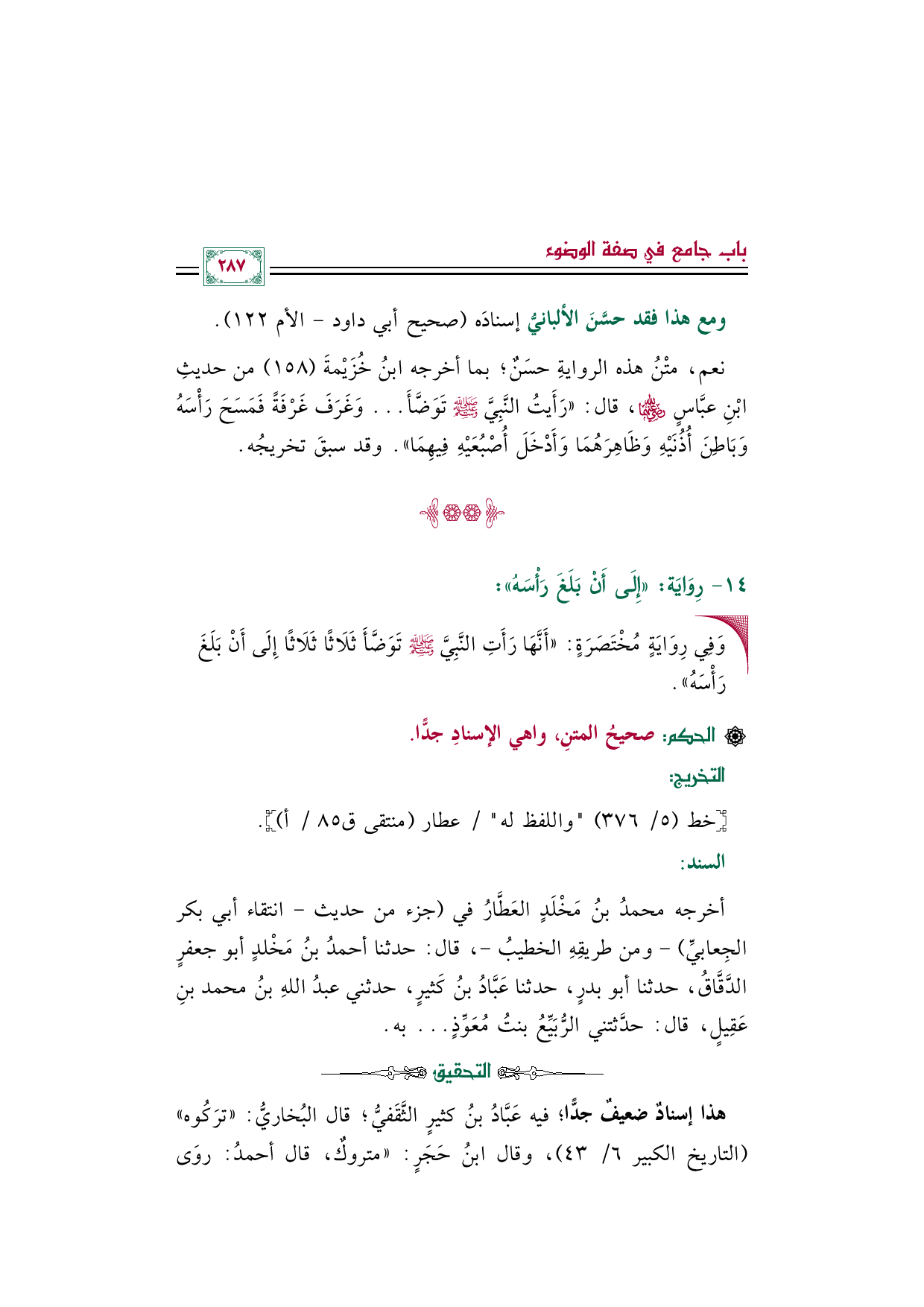 • وَفِي رِوَايَةٍ مُخْتَصَرَةٍ: «أَنَّهَا رَأَتِ النَّبِيَّ صلى الله عليه وسلم تَوَضَّأَ ثَلَاثًا ثَلَاثًا إِلَى أَنْ بَلَغَ رَأْسَهُ».
