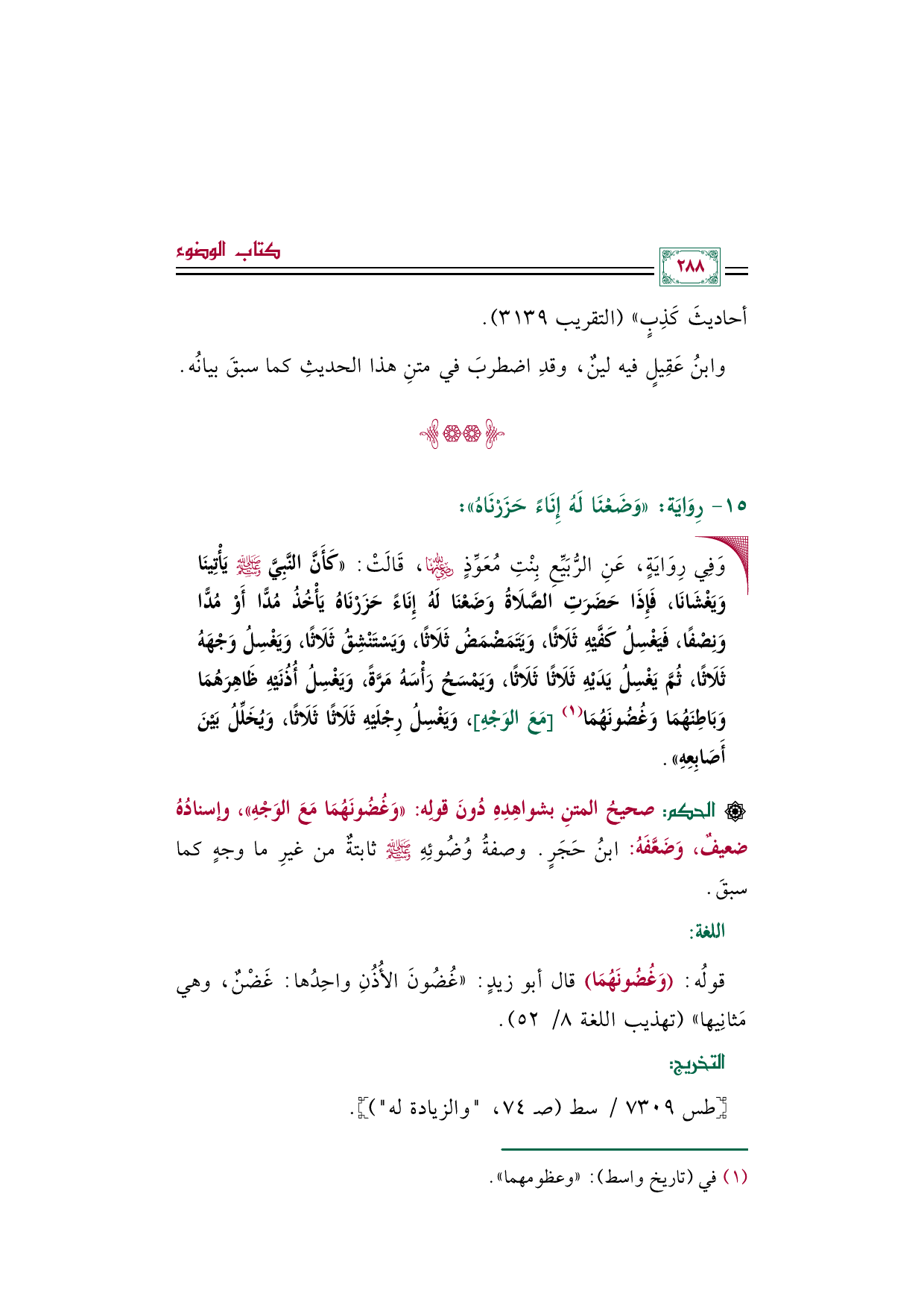 [الحكم]: صحيحُ المتنِ بشواهِدِهِ دُونَ قولِه: «وَغُضُونَهُمَا مَعَ الوَجْهِ»، وإسنادُهُ ضعيفٌ، وَضَعَّفَهُ ابنُ حَجَرٍ. وصفةُ وُضُوئِهِ صلى الله عليه وسلم ثابتةٌ من غيرِ ما وجهٍ كما سبقَ.