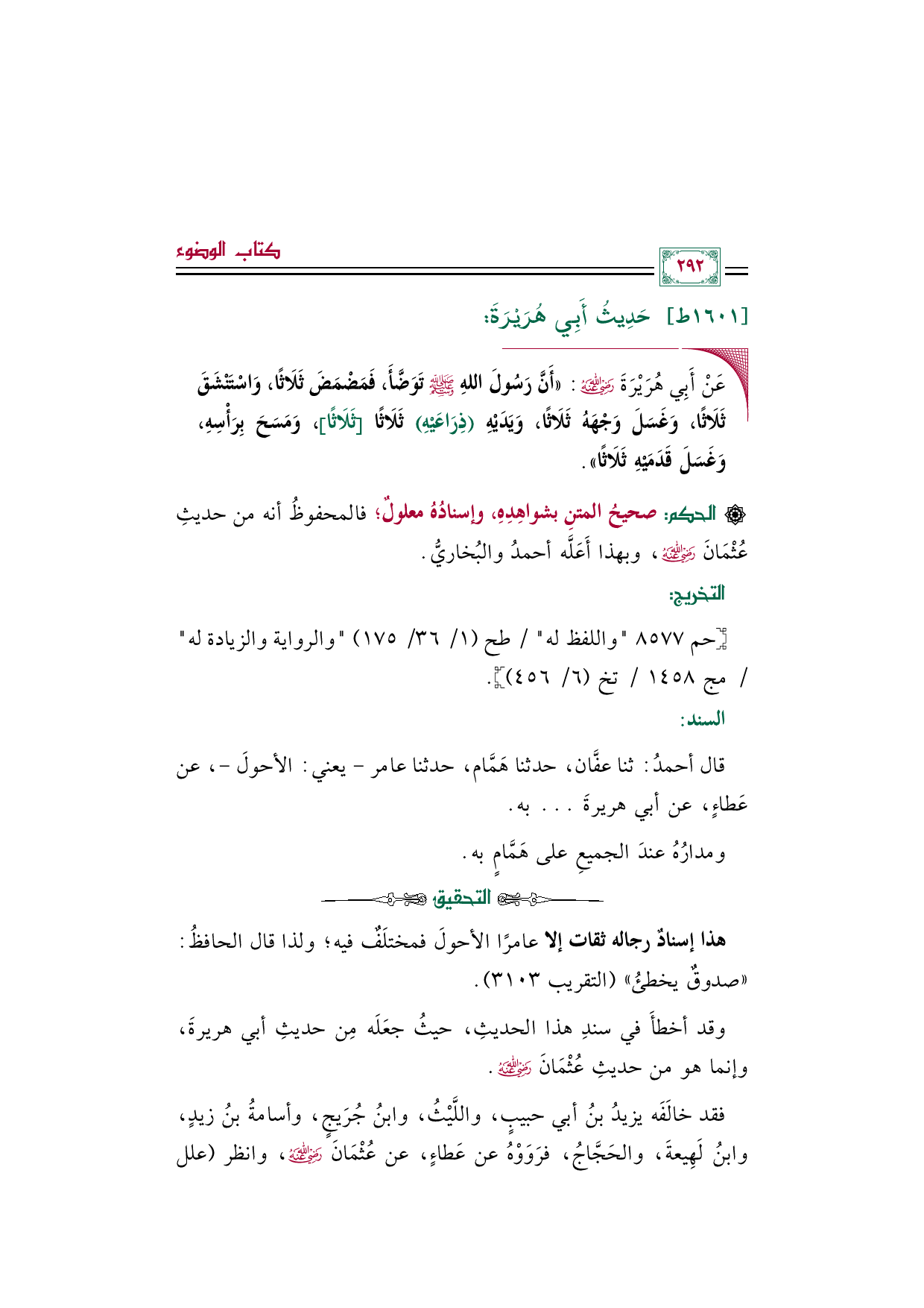 وقد أخطأَ في سندِ هذا الحديثِ، حيثُ جعَلَه مِن حديثِ أبي هريرةَ، وإنما هو من حديثِ عُثْمَانَ رضي الله عنه.