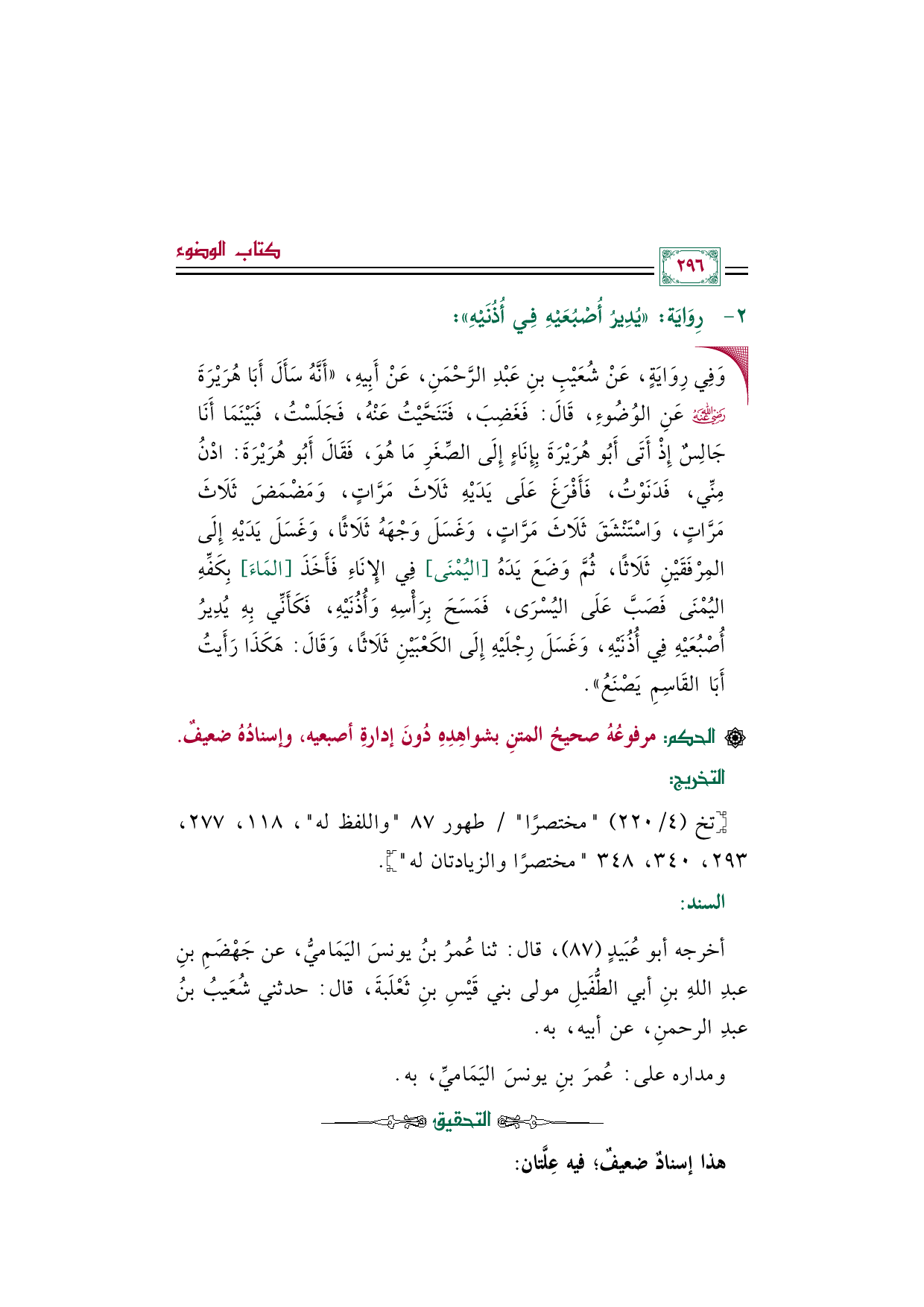• وَفِي رِوَايَةٍ، عَنْ شُعَيْبِ بنِ عَبْدِ الرَّحْمَنِ، عَنْ أَبِيهِ، ((أَنَّهُ سَأَلَ أَبَا هُرَيْرَةَ رضي الله عنه عَنِ الوُضُوءِ، قَالَ: فَغَضِبَ، فَتَنَحَّيْتُ عَنْهُ، فَجَلَسْتُ، فَبَيْنَمَا أَنَا جَالِسٌ إِذْ أَتَى أَبُو هُرَيْرَةَ بِإِنَاءٍ إِلَى الصِّغَرِ مَا هُوَ، فَقَالَ أَبُو هُرَيْرَةَ: ادْنُ مِنِّي، فَدَنَوْتُ، فَأَفْرَغَ عَلَى يَدَيْهِ ثَلَاثَ مَرَّاتٍ، وَمَضْمَضَ ثَلَاثَ مَرَّاتٍ، وَاسْتَنْشَقَ ثَلَاثَ مَرَّاتٍ، وَغَسَلَ وَجْهَهُ ثَلَاثًا، وَغَسَلَ يَدَيْهِ إِلَى المِرْفَقَيْنِ ثَلَاثًا، ثُمَّ وَضَعَ يَدَهُ [اليُمْنَى] فِي الإِنَاءِ فَأَخَذَ [المَاءَ] بِكَفِّهِ اليُمْنَى فَصَبَّ عَلَى اليُسْرَى، فَمَسَحَ بِرَأْسِهِ وَأُذُنَيْهِ، فَكَأَنِّي بِهِ يُدِيرُ أُصْبُعَيْهِ فِي أُذُنَيْهِ، وَغَسَلَ رِجْلَيْهِ إِلَى الكَعْبَيْنِ ثَلَاثًا، وَقَالَ: هَكَذَا رَأَيتُ أَبَا القَاسِمِ يَصْنَعُ)).