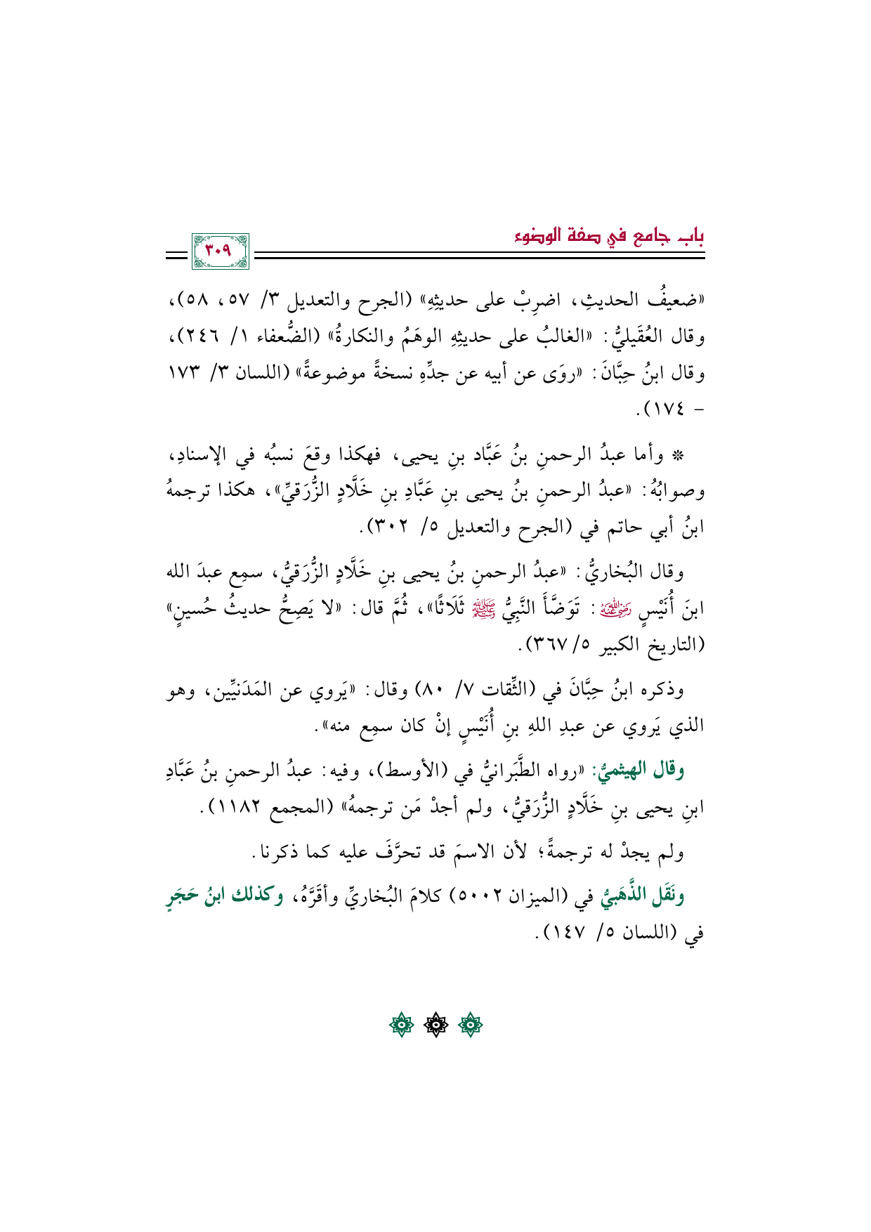 وقال الهيثميُّ: "رواه الطَّبَرانيُّ في (الأوسط)، وفيه: عبدُ الرحمنِ بنُ عَبَّادِ بنِ يحيى بنِ خَلَّادٍ الزُّرَقيُّ، ولم أجدْ مَن ترجمهُ" (المجمع ١١٨٢).