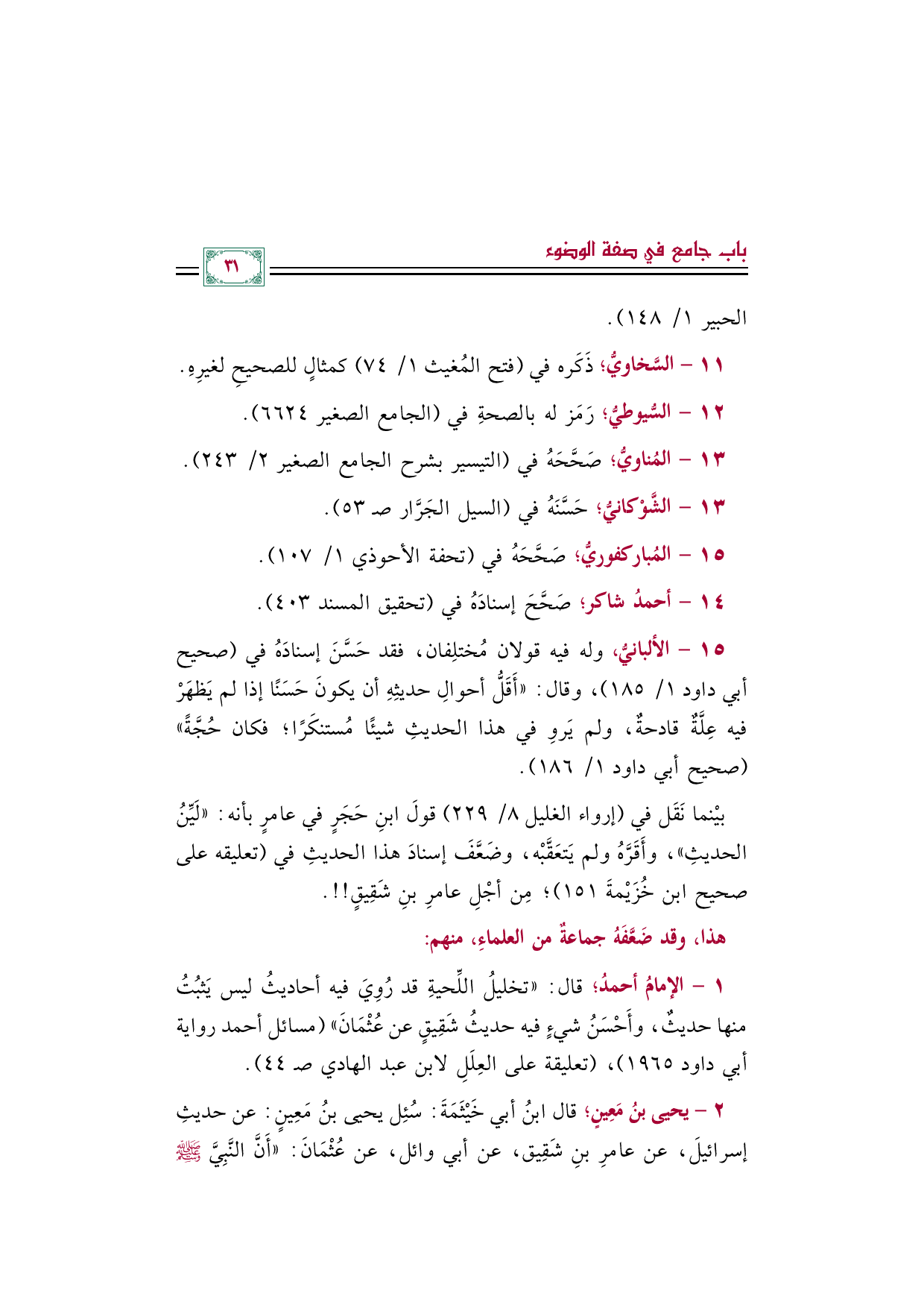٢ - يحيى بنُ مَعِينٍ؛ قال ابنُ أبي خَيْثَمَةَ: سُئِل يحيى بنُ مَعِينٍ: عن حديثِ إسرائيلَ، عن عامرِ بنِ شَقِيق، عن أبي وائل، عن عُثْمَانَ: ((أَنَّ النَّبِيَّ صلى الله عليه وسلم