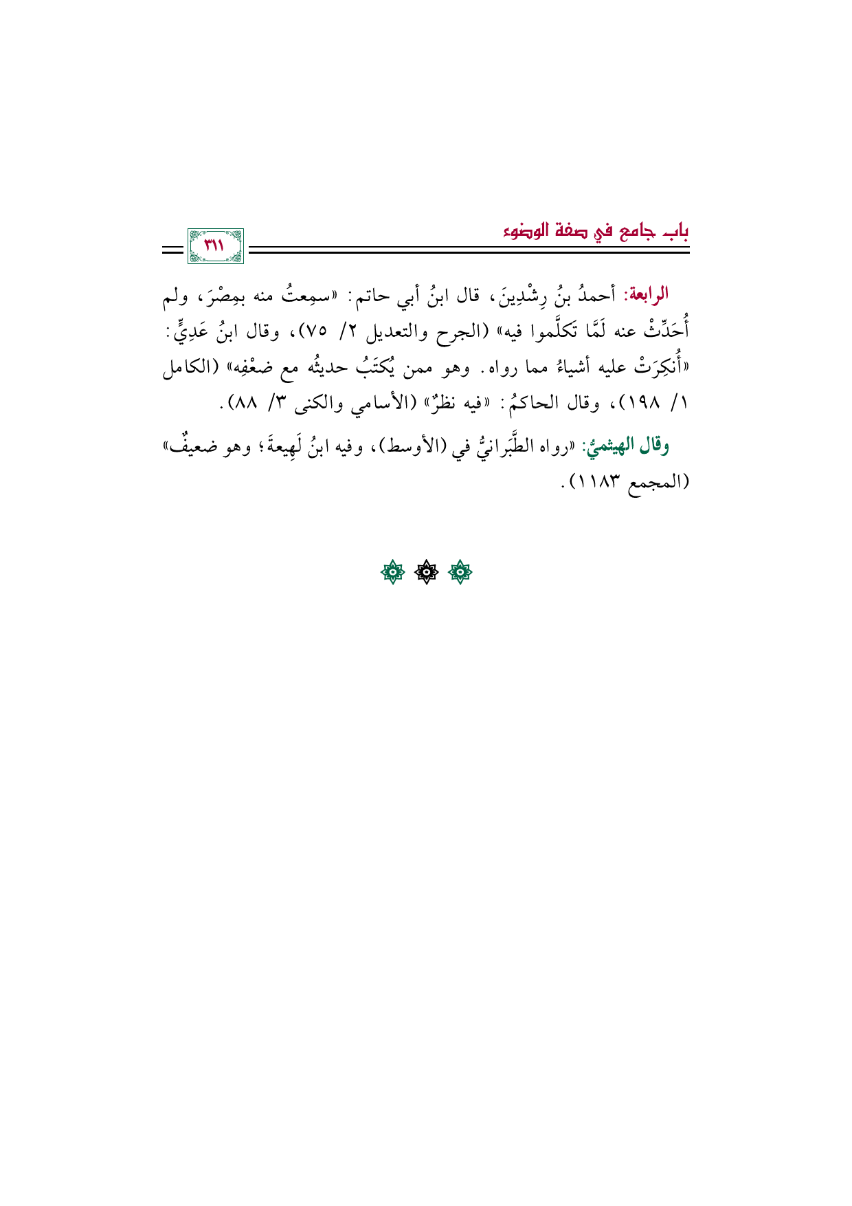 الرابعة: أحمدُ بنُ رِشْدِينَ، قال ابنُ أبي حاتم: "سمِعتُ منه بمِصْرَ، ولم أُحَدِّثْ عنه لَمَّا تَكلَّموا فيه" (الجرح والتعديل ٢/ ٧٥)، وقال ابنُ عَدِيٍّ: "أُنكِرَتْ عليه أشياءُ مما رواه. وهو ممن يُكتَبُ حديثُه مع ضعْفِه" (الكامل ١/ ١٩٨)، وقال الحاكمُ: "فيه نظرٌ" (الأسامي والكنى ٣/ ٨٨).
