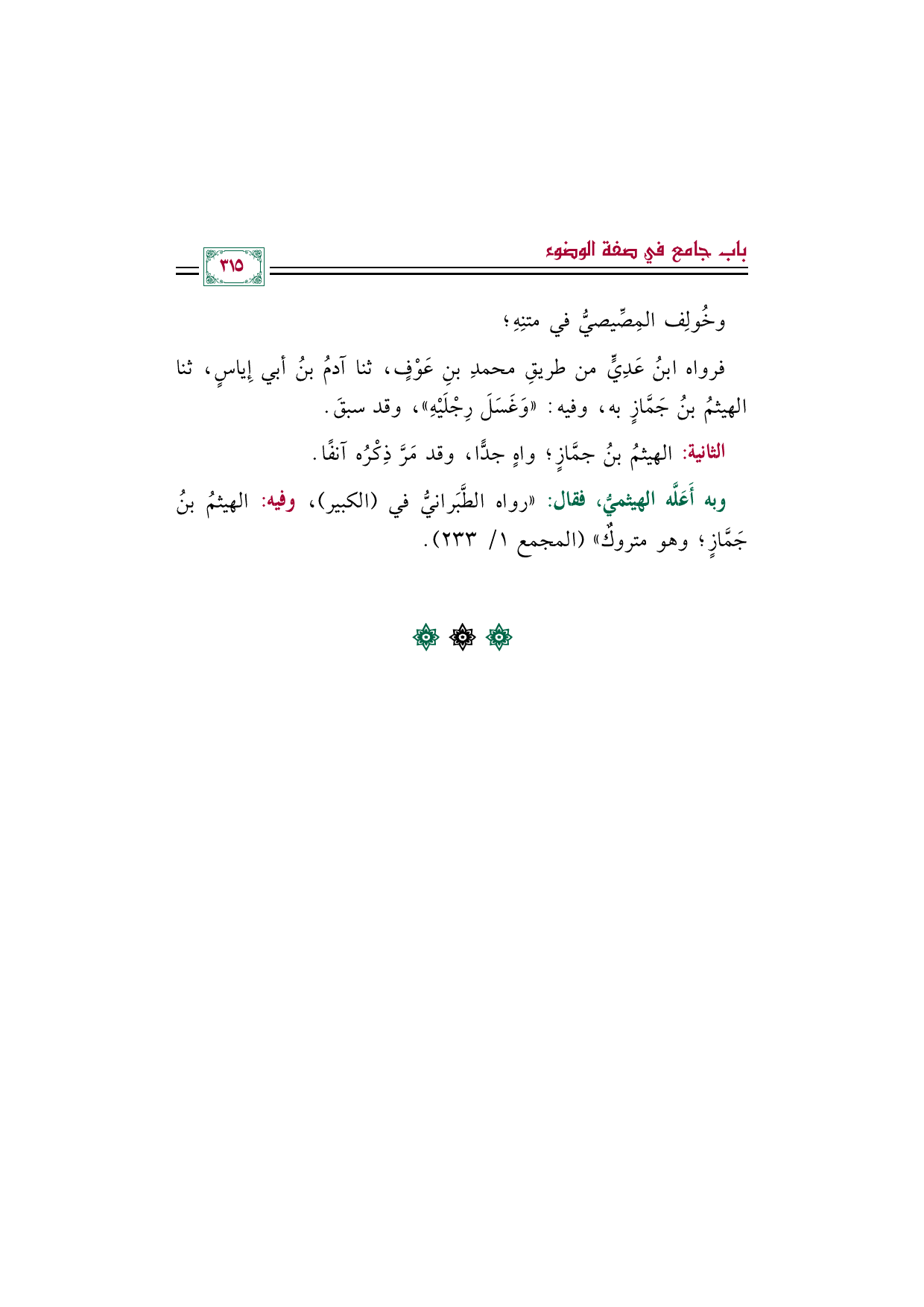 وبه أَعَلَّه الهيثميُّ، فقال: "رواه الطَّبَرانيُّ في (الكبير)، وفيه: الهيثمُ بنُ جَمَّازٍ؛ وهو متروكٌ" (المجمع ١/ ٢٣٣).