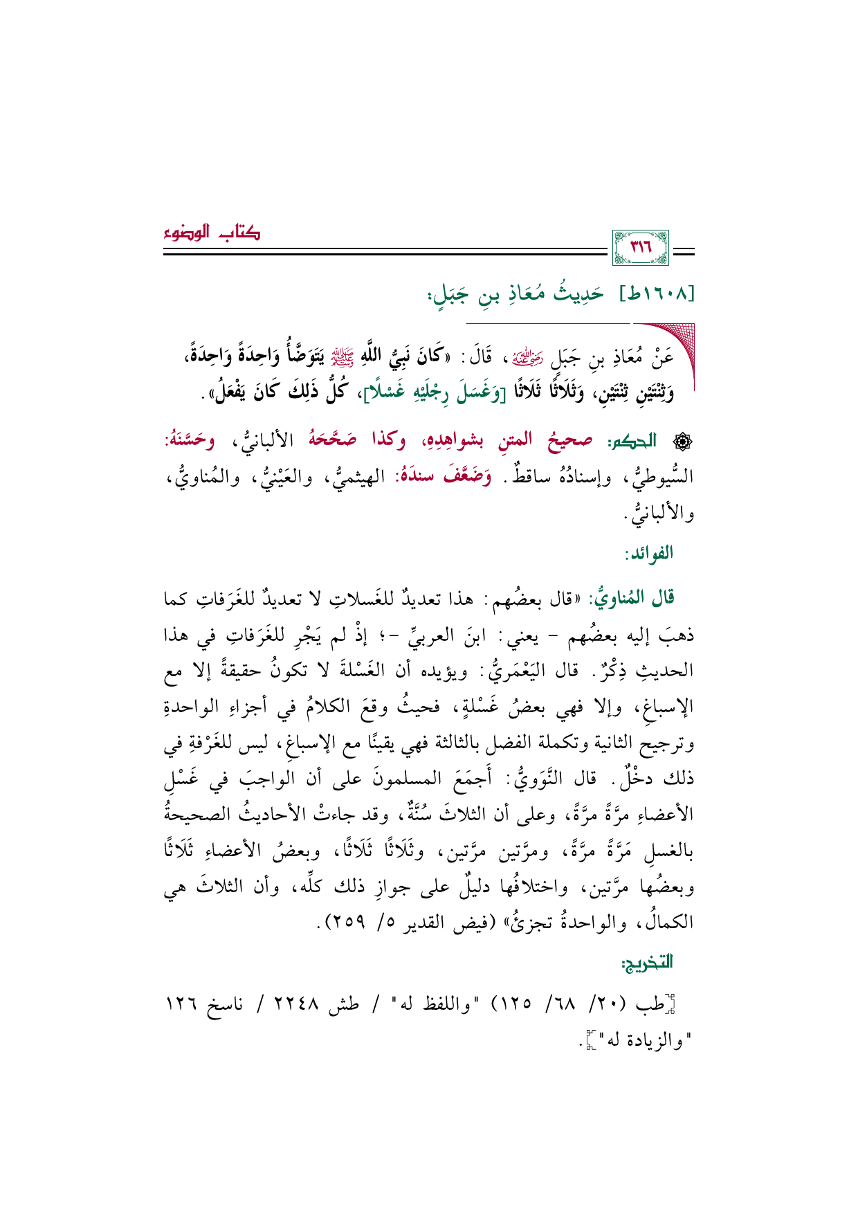 قال المُناويُّ: "قال بعضُهم: هذا تعديدٌ للغَسلاتِ لا تعديدٌ للغَرَفاتِ كما ذهبَ إليه بعضُهم -يعني: ابنَ العربيِّ-؛ إذْ لم يَجْرِ للغَرَفاتِ في هذا الحديثِ ذِكْرٌ. قال اليَعْمَريُّ: ويؤيده أن الغَسْلةَ لا تكونُ حقيقةً إلا مع الإسباغِ، وإلا فهي بعضُ غَسْلةٍ، فحيثُ وقعَ الكلامُ في أجزاءِ الواحدةِ وترجيح الثانية وتكملة الفضل بالثالثة فهي يقينًا مع الإسباغِ، ليس للغَرْفةِ في ذلك دخْلٌ. قال النَّوَويُّ: أَجمَعَ المسلمونَ على أن الواجبَ في غَسْلِ الأعضاءِ مرَّةً مرَّةً، وعلى أن الثلاثَ سُنَّةٌ، وقد جاءتْ الأحاديثُ الصحيحةُ بالغسلِ مَرَّةً مرَّةً، ومرَّتين مرَّتين، وثَلَاثًا ثَلَاثًا، وبعضُ الأعضاءِ ثَلَاثًا وبعضُها مرَّتين، واختلافُها دليلٌ على جوازِ ذلك كلِّه، وأن الثلاثَ هي الكمالُ، والواحدةُ تجزئُ" (فيض القدير ٥/ ٢٥٩).