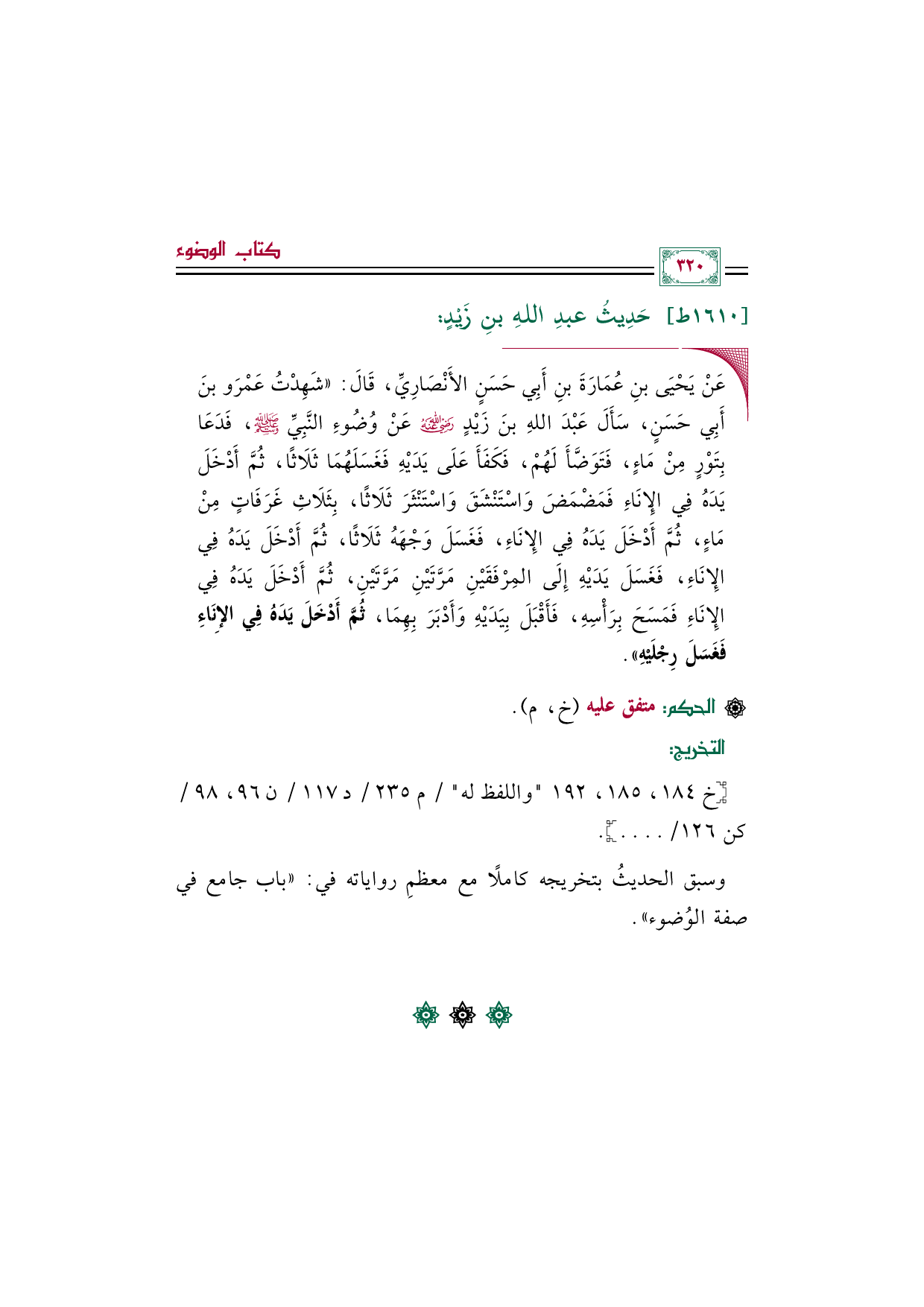 ◼ عَنْ يَحْيَى بنِ عُمَارَةَ بنِ أَبِي حَسَنٍ الأَنْصَارِيِّ، قَالَ: ((شَهِدْتُ عَمْرَو بنَ أَبِي حَسَنٍ، سَأَلَ عَبْدَ اللهِ بنَ زَيْدٍ رضي الله عنه عَنْ وُضُوءِ النَّبِيِّ صلى الله عليه وسلم، فَدَعَا بِتَوْرٍ مِنْ مَاءٍ، فَتَوَضَّأَ لَهُمْ، فَكَفَأَ عَلَى يَدَيْهِ فَغَسَلَهُمَا ثَلَاثًا، ثُمَّ أَدْخَلَ يَدَهُ فِي الإِنَاءِ فَمَضْمَضَ وَاسْتَنْشَقَ وَاسْتَنْثَرَ ثَلَاثًا، بِثَلَاثِ غَرَفَاتٍ مِنْ مَاءٍ، ثُمَّ أَدْخَلَ يَدَهُ فِي الإِنَاءِ، فَغَسَلَ وَجْهَهُ ثَلَاثًا، ثُمَّ أَدْخَلَ يَدَهُ فِي الإِنَاءِ، فَغَسَلَ يَدَيْهِ إِلَى المِرْفَقَيْنِ مَرَّتَيْنِ مَرَّتَيْنِ، ثُمَّ أَدْخَلَ يَدَهُ فِي الإِنَاءِ فَمَسَحَ بِرَأْسِهِ، فَأَقْبَلَ بِيَدَيْهِ وَأَدْبَرَ بِهِمَا، ثُمَّ أَدْخَلَ يَدَهُ فِي الإِنَاءِ فَغَسَلَ رِجْلَيْهِ)).