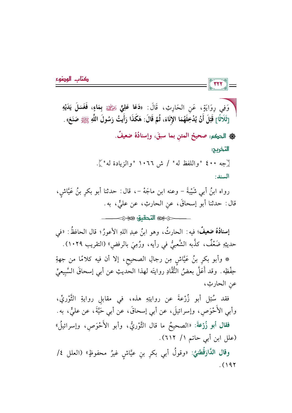 * وأبو بكرِ بنُ عَيَّاشٍ مِن رجالِ الصحيحِ، إلا أن فيه كلامًا من جهةِ حِفْظِه. وقد أَعَلَّ بعضُ النُّقَّادِ روايتَه لهذا الحديثِ عن أبي إسحاقَ السَّبِيعيِّ عنِ الحارثِ،