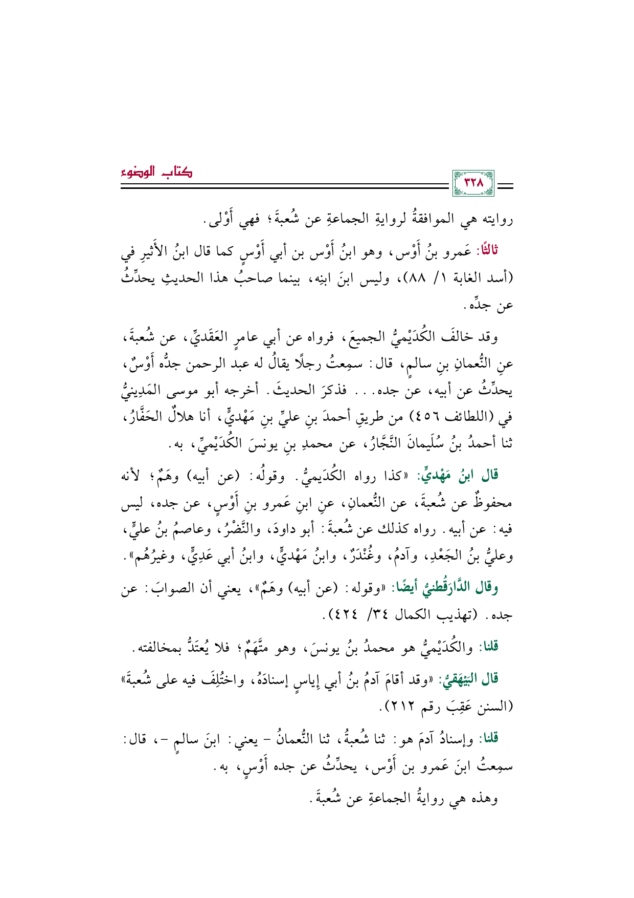 وقد خالفَ الكُدَيْميُّ الجميعَ، فرواه عن أبي عامرٍ العَقَديِّ، عن شُعبةَ، عنِ النُّعمانِ بنِ سالمٍ، قال: سمِعتُ رجلًا يقالُ له عبد الرحمن جدُّه أَوْسٌ، يحدِّثُ عن أبيه، عن جده ... فذكرَ الحديثَ. أخرجه أبو موسى المَدِينيُّ في (اللطائف ٤٥٦) من طريقِ أحمدَ بنِ عليِّ بنِ مَهْديٍّ، أنا هلالٌ الحَفَّارُ، ثنا أحمدُ بنُ سُلَيمانَ النَّجَّارُ، عن محمدِ بنِ يونسَ الكُدَيْميِّ، به.