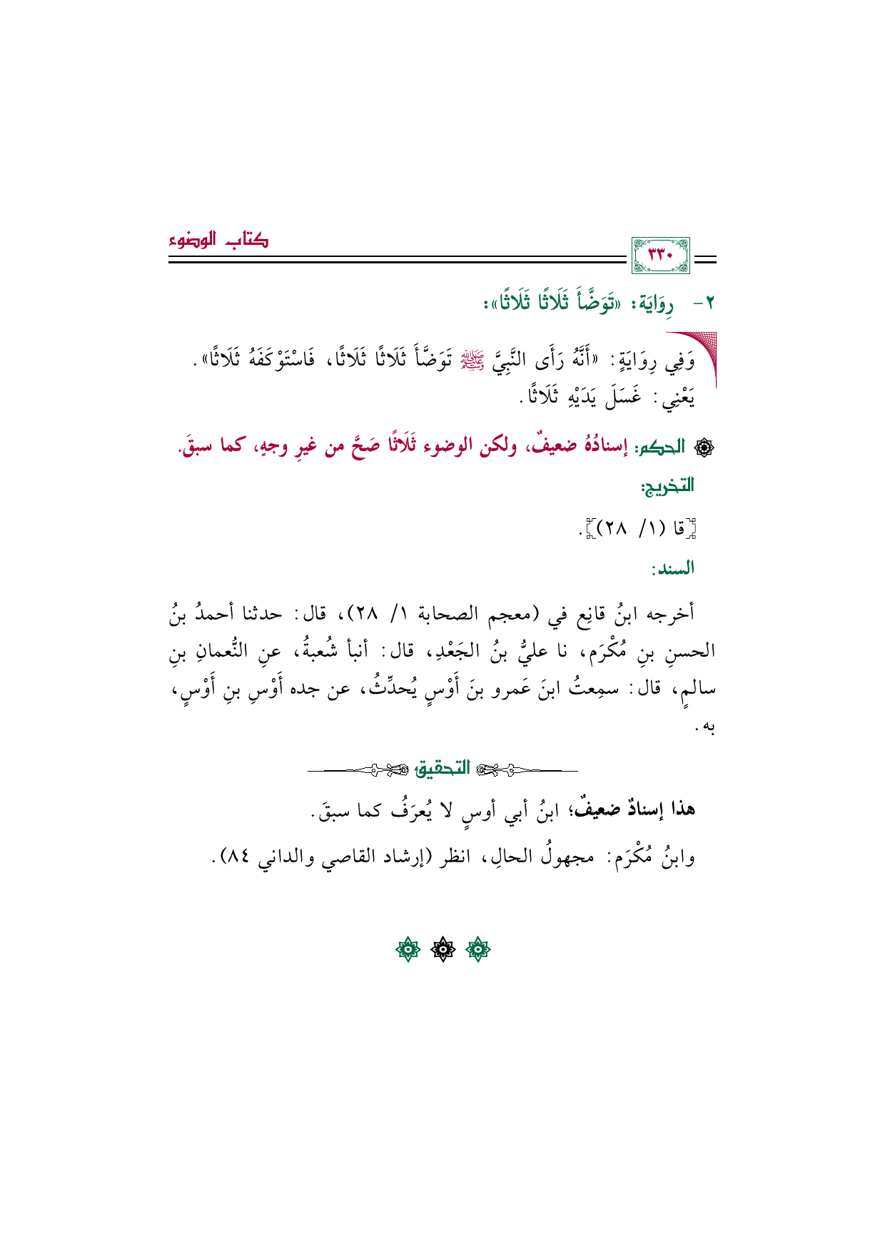 [الحكم]: إسنادُهُ ضعيفٌ، ولكن الوضوء ثَلَاثًا صَحَّ من غيرِ وجهٍ، كما سبقَ.