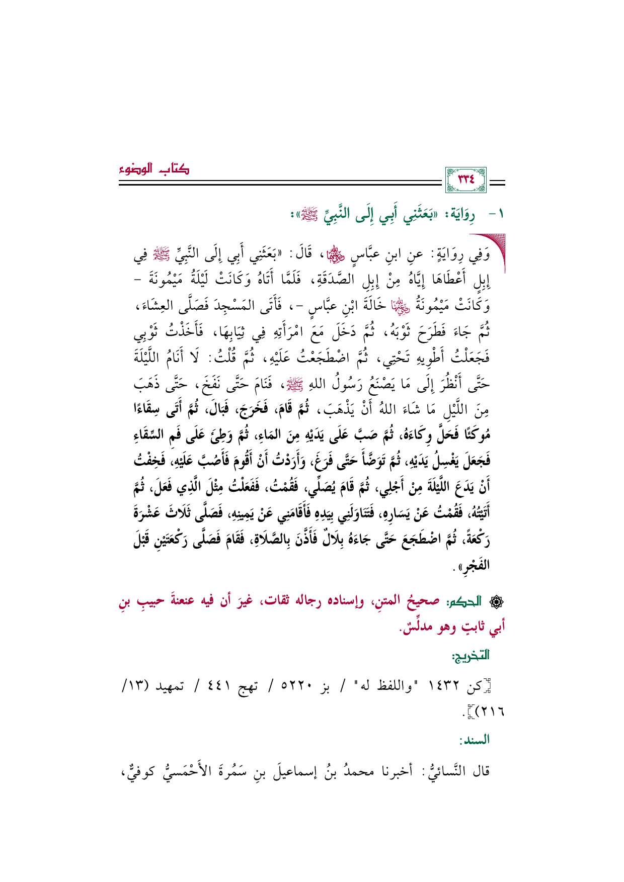 • وَفِي رِوَايَةٍ: عنِ ابنِ عبَّاسٍ رضي الله عنهما، قَالَ: «بَعَثَنِي أَبِي إِلَى النَّبِيِّ صلى الله عليه وسلم فِي إِبِلٍ أَعْطَاهَا إِيَّاهُ مِنْ إِبِلِ الصَّدَقَةِ، فَلَمَّا أَتَاهُ وَكَانَتْ لَيْلَةُ مَيْمُونَةَ -وَكَانَتْ مَيْمُونَةُ رضي الله عنها خَالَةَ ابْنِ عبَّاسٍ-، فَأَتَى المَسْجِدَ فَصَلَّى العِشَاءَ، ثُمَّ جَاءَ فَطَرَحَ ثَوْبَهُ، ثُمَّ دَخَلَ مَعَ امْرَأَتِهِ فِي ثِيَابِهَا، فَأَخَذْتُ ثَوْبِي فَجَعَلْتُ أَطْوِيهِ تَحْتِي، ثُمَّ اضْطَجَعْتُ عَلَيْهِ، ثُمَّ قُلْتُ: لَا أَنَامُ اللَّيْلَةَ حَتَّى أَنْظُرَ إِلَى مَا يَصْنَعُ رَسُولُ اللهِ صلى الله عليه وسلم، فَنَامَ حَتَّى نَفَخَ، حَتَّى ذَهَبَ مِنَ اللَّيْلِ مَا شَاءَ اللهُ أَنْ يَذْهَبَ، ثُمَّ قَامَ، فَخَرَجَ، فَبَالَ، ثُمَّ أَتَى سِقَاءًا مُوكَئًا فَحَلَّ وِكَاءَهُ، ثُمَّ صَبَّ عَلَى يَدَيْهِ مِنَ المَاءِ، ثُمَّ وَطِئَ عَلَى فَمِ السِّقَاءِ فَجَعَلَ يَغْسِلُ يَدَيْهِ، ثُمَّ تَوَضَّأَ حَتَّى فَرَغَ، وَأَرَدْتُ أَنْ أَقُومَ فَأَصُبَّ عَلَيْهِ، فَخِفْتُ أَنْ يَدَعَ اللَّيْلَةَ مِنْ أَجْلِي، ثُمَّ قَامَ يُصَلِّي، فَقُمْتُ، فَفَعَلْتُ مِثْلَ الَّذِي فَعَلَ، ثُمَّ أَتَيْتُهُ، فَقُمْتُ عَنْ يَسَارِهِ، فَتَنَاوَلَنِي بِيَدِهِ فَأَقَامَنِي عَنْ يَمِينِهِ، فَصَلَّى ثَلَاثَ عَشْرَةَ رَكْعَةً، ثُمَّ اضْطَجَعَ حَتَّى جَاءَهُ بِلَالٌ فَأَذَّنَ بِالصَّلَاةِ، فَقَامَ فَصَلَّى رَكْعَتَيْنِ قَبْلَ الفَجْرِ».