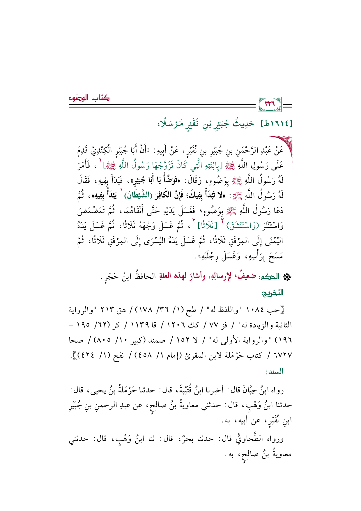 ◼ عَنْ عَبْدِ الرَّحْمَنِ بنِ جُبَيْرِ بنِ نُفَيْرٍ، عَنْ أَبِيهِ: ((أَنَّ أَبَا جُبَيْرٍ الْكِنْدِيَّ قَدِمَ عَلَى رَسُولِ اللَّهِ صلى الله عليه وسلم [بِابْنَتِهِ الَّتِي كَانَ تَزَوَّجَهَا رَسُولُ اللَّهِ صلى الله عليه وسلم] ١، فَأَمَرَ لَهُ رَسُولُ اللَّهِ صلى الله عليه وسلم بِوَضُوءٍ، وَقَالَ: ((تَوَضَّأْ يَا أَبَا جُبَيْرٍ))، فَبَدَأَ بِفِيهِ، فَقَالَ لَهُ رَسُولُ اللَّهِ صلى الله عليه وسلم: ((لا تَبْدَأْ بِفِيكَ؛ فَإِنَّ الكَافِرَ (الشَّيْطَانَ) ١ يَبْدَأُ بِفِيهِ))، ثُمَّ دَعَا رَسُولُ اللَّهِ صلى الله عليه وسلم بِوَضُوءٍ؛ فَغَسَلَ يَدَيْهِ حَتَّى أَنْقَاهُمَا، ثُمَّ تَمَضْمَضَ وَاسْتَنْثَرَ (وَاسْتَنْشَقَ) ٢ [ثَلَاثًا] ٢، ثُمَّ غَسَلَ وَجْهَهُ ثَلَاثًا، ثُمَّ غَسَلَ يَدَهُ اليُمْنَى إِلَى المِرْفَقِ ثَلَاثًا، ثُمَّ غَسَلَ يَدَهُ اليُسْرَى إِلَى المِرْفَقِ ثَلَاثًا، ثُمَّ مَسَحَ بِرَأْسِهِ، وَغَسَلَ رِجْلَيْهِ)).