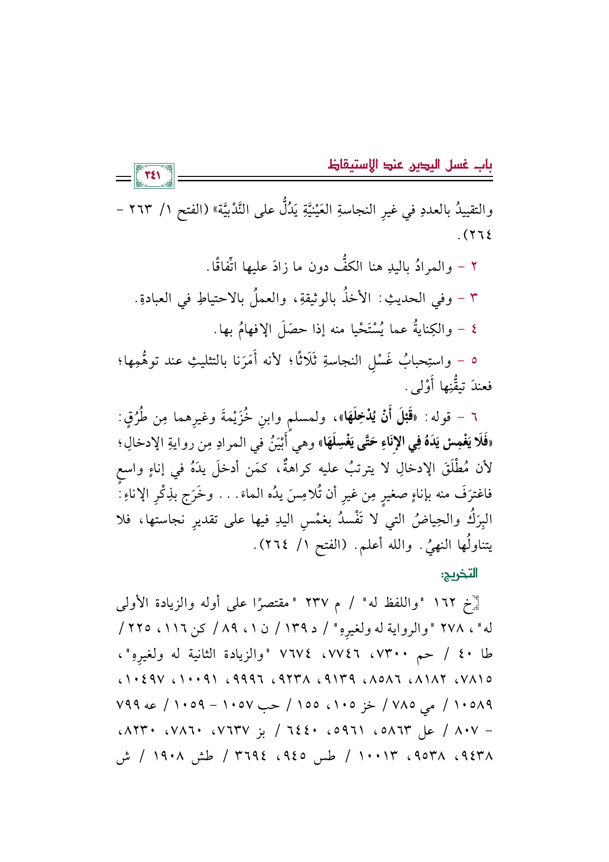 ٦ - قوله: «قَبْلَ أَنْ يُدْخِلَهَا»، ولمسلمٍ وابنِ خُزَيْمةَ وغيرِهما مِن طُرُقٍ: «فَلَا يَغْمِسْ يَدَهُ فِي الإِنَاءِ حَتَّى يَغْسِلَهَا» وهي أَبْيَنُ في المرادِ مِن روايةِ الإدخالِ؛ لأن مُطْلَقَ الإدخالِ لا يترتبُ عليه كراهةٌ، كمَن أدخلَ يدَهُ في إناءٍ واسعٍ فاغترَفَ منه بإناءٍ صغيرٍ مِن غيرِ أن تُلامِسَ يدُه الماءَ ... وخَرَج بذِكْرِ الإناءِ: البِرَكُ والحِياضُ التي لا تَفْسدُ بغمْسِ اليدِ فيها على تقديرِ نجاستها، فلا يتناولُها النهيُ. والله أعلم. (الفتح ١/ ٢٦٤).
