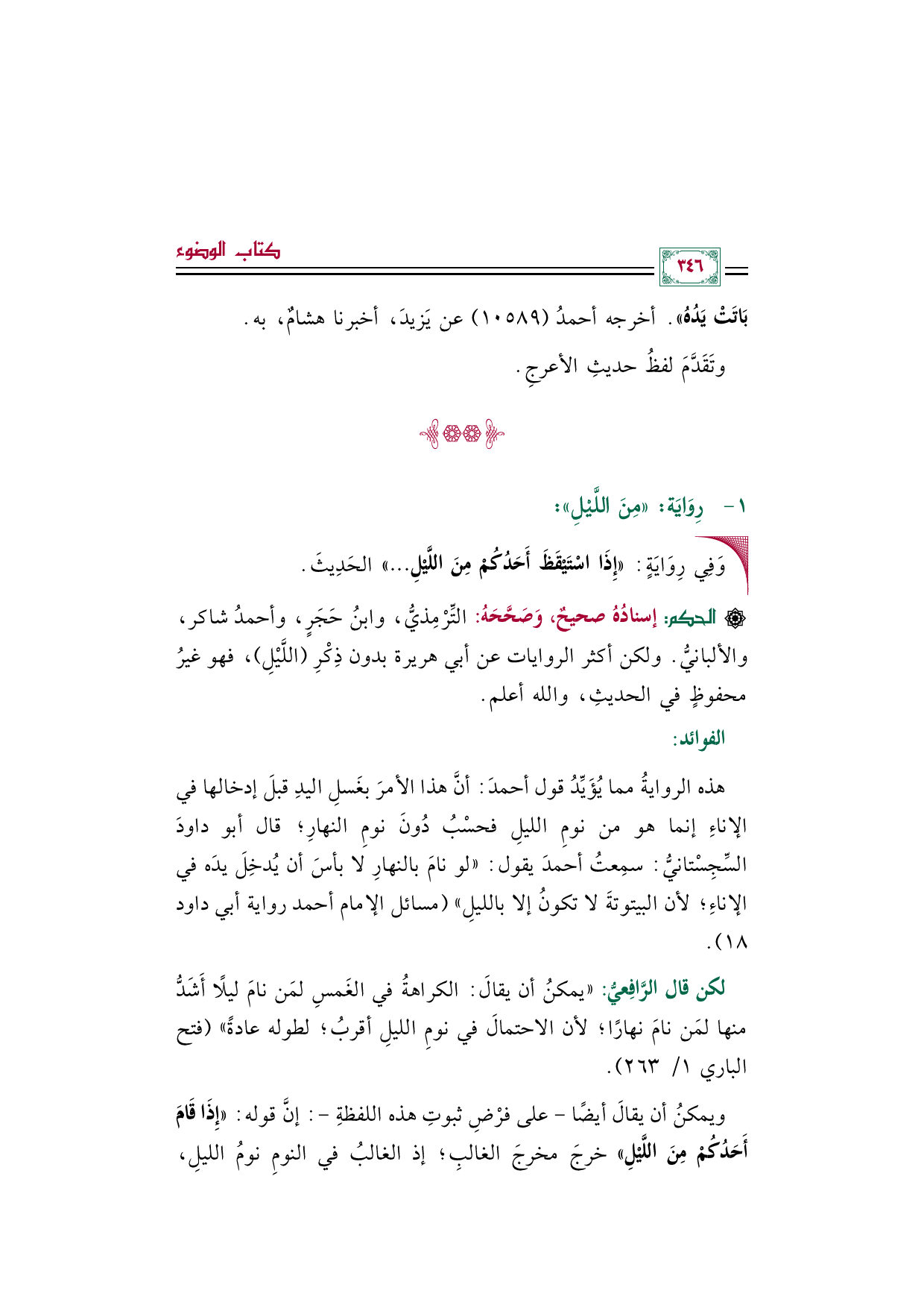 هذه الروايةُ مما يُؤَيِّدُ قول أحمدَ: أنَّ هذا الأمرَ بغَسلِ اليدِ قبلَ إدخالها في الإناءِ إنما هو من نومِ الليلِ فحسْبُ دُونَ نومِ النهارِ؛ قال أبو داودَ السِّجِسْتانيُّ: سمِعتُ أحمدَ يقول: ((لو نامَ بالنهارِ لا بأسَ أن يُدخِلَ يدَه في الإناءِ؛ لأن البيتوتةَ لا تكونُ إلا بالليلِ)) (مسائل الإمام أحمد رواية أبي داود ١٨).