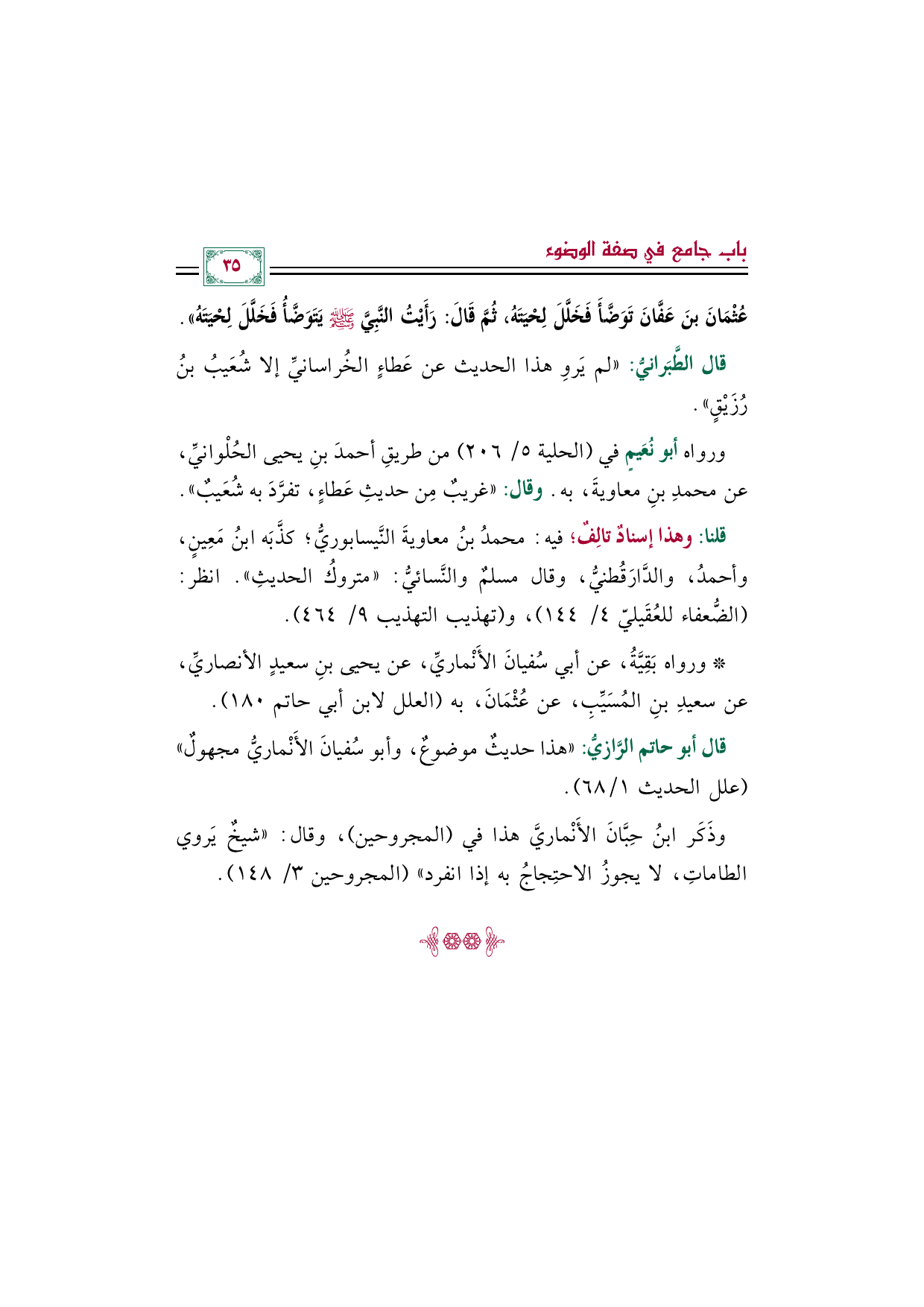 ورواه أبو نُعَيمٍ في (الحلية ٥/ ٢٠٦) من طريقِ أحمدَ بنِ يحيى الحُلْوانيِّ، عن محمدِ بنِ معاويةَ، به. وقال: "غريبٌ مِن حديثِ عَطاءٍ، تفرَّدَ به شُعَيبٌ".