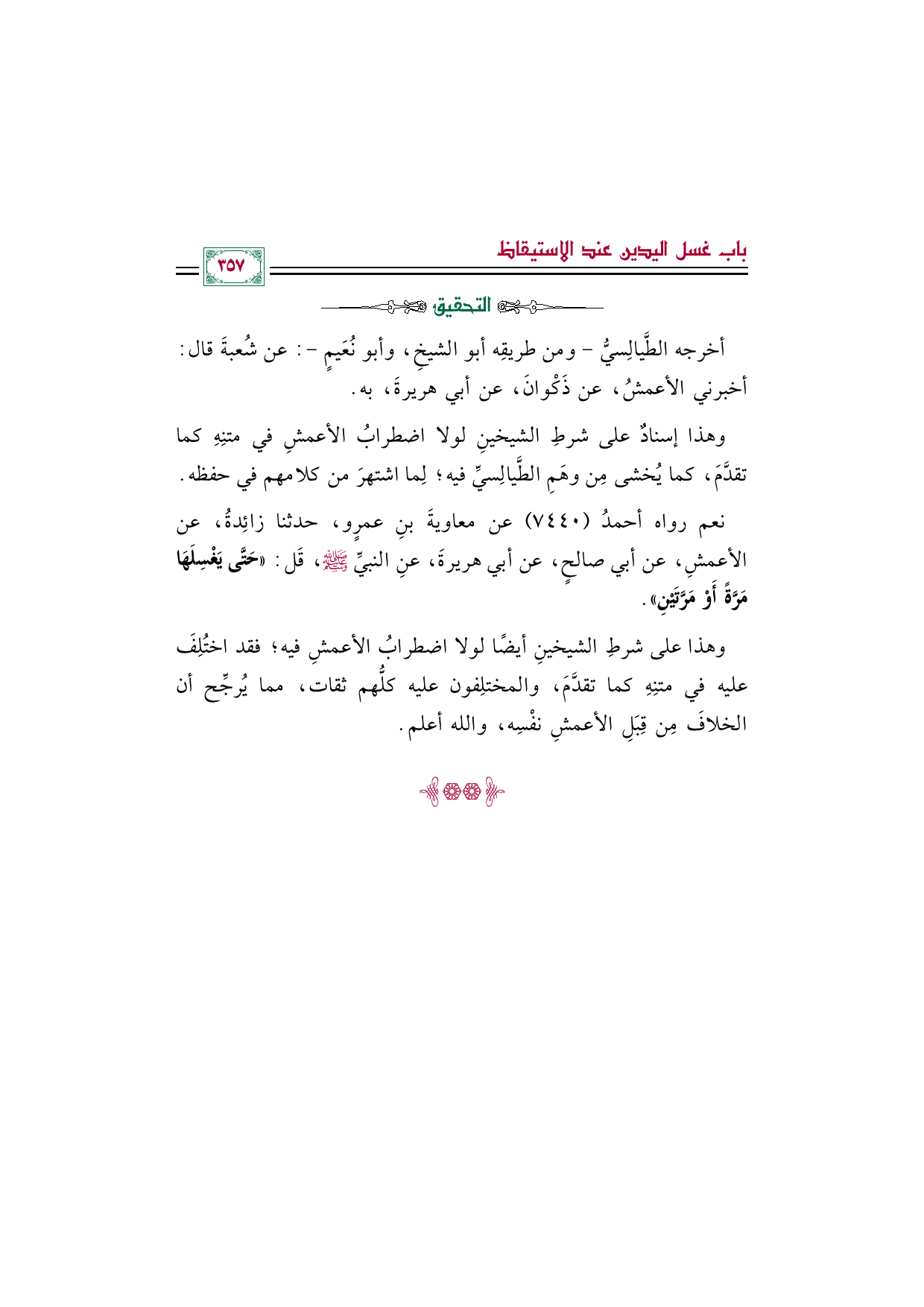 وهذا إسنادٌ على شرطِ الشيخينِ لولا اضطرابُ الأعمشِ في متنِهِ كما تقدَّمَ، كما يُخشى مِن وهَمِ الطَّيالِسيِّ فيه؛ لِما اشتهرَ من كلامهم في حفظه.
