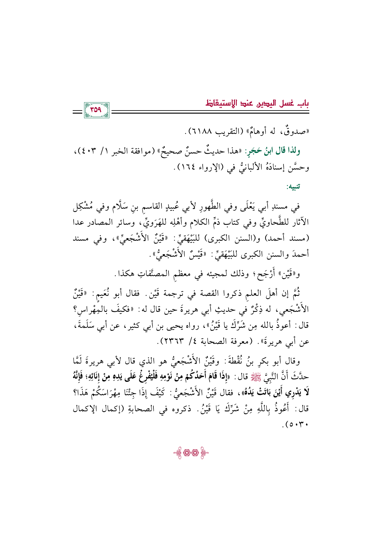 وقال أبو بكرِ بنُ نُقْطةَ: وقَيْنٌ الأَشْجَعيُّ هو الذي قال لأبي هريرةَ لَمَّا حدَّثَ أَنَّ النَّبِيَّ صلى الله عليه وسلم قال: ((إِذَا قَامَ أَحَدُكُمْ مِنْ نَوْمِهِ فَلْيُفْرِغْ عَلَى يَدِهِ مِنْ إِنَائِهِ؛ فَإِنَّهُ لَا يَدْرِي أَيْنَ بَاتَتْ يَدُهُ))، فقال قَيْنٌ الأَشْجَعيُّ: كَيْفَ إِذَا جِئْنَا مِهْرَاسَكُمْ هَذَا؟ قال: أَعُوذُ بِاللَّهِ مِنْ شَرِّكَ يَا قَيْنُ. ذكروه في الصحابةِ (إكمال الإكمال ٥٠٣٠).