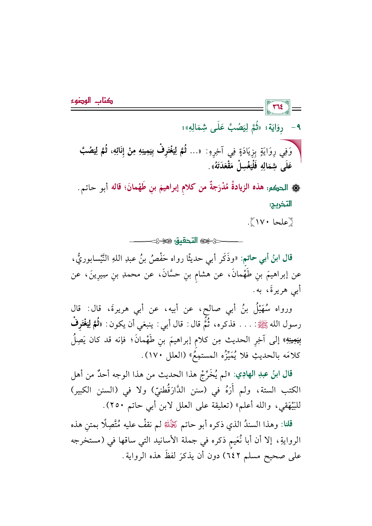 ورواه سُهَيْلُ بنُ أبي صالحٍ، عن أبيه، عن أبي هريرةَ، قال: قال رسول الله صلى الله عليه وسلم: ... فذكره، ثُمَّ قال: قال أبي: ينبغي أن يكون: «ثُمَّ لِيَغْتَرِفْ بِيَمِينِهِ» إلى آخِرِ الحديث مِن كلامِ إبراهيمَ بنِ طَهْمانَ؛ فإنه قد كان يَصِلُ كلامَه بالحديثِ فلا يُمَيِّزُه المستمِعُ" (العلل ١٧٠).
