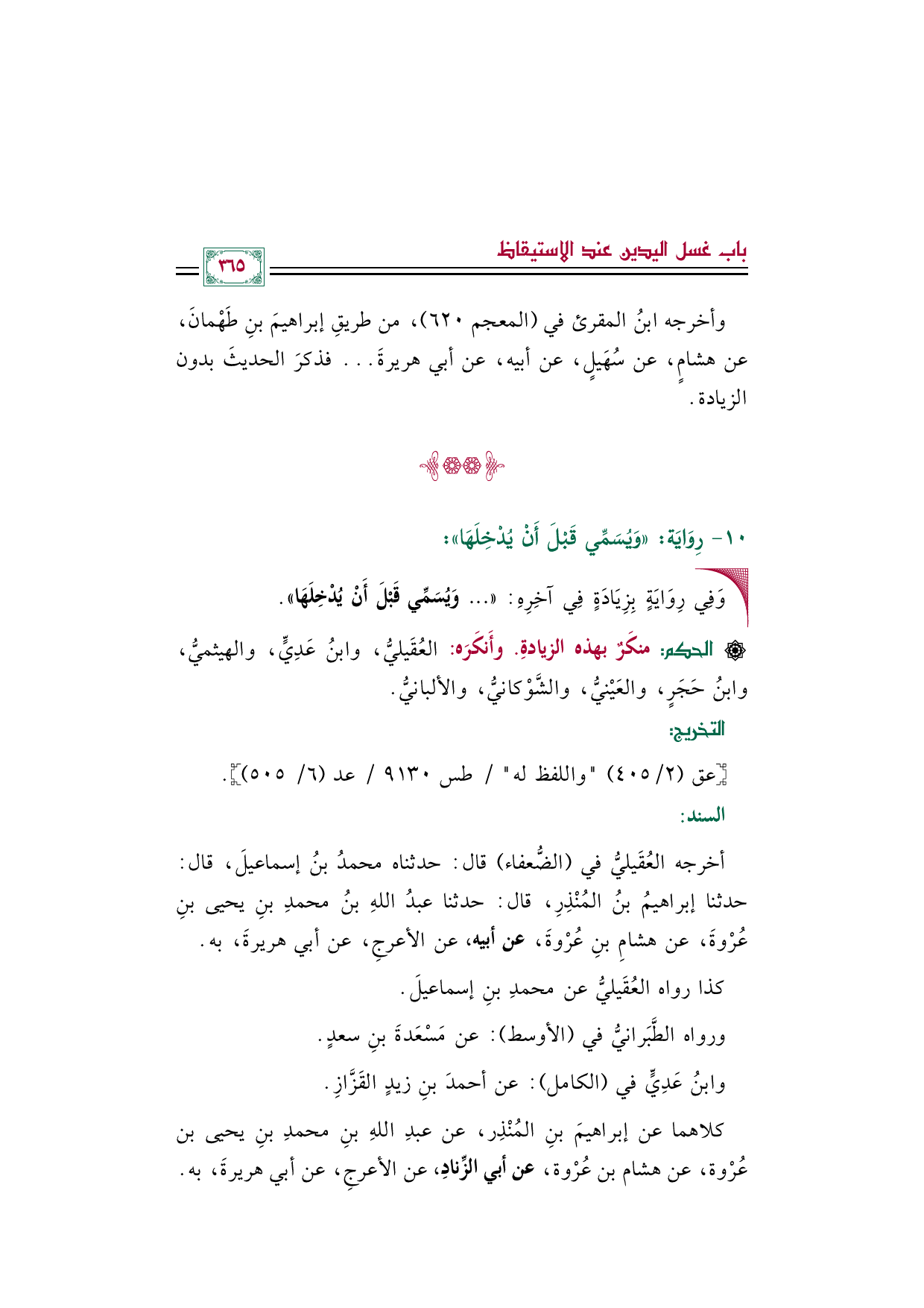 أخرجه العُقَيليُّ في (الضُّعفاء) قال: حدثناه محمدُ بنُ إسماعيلَ، قال: حدثنا إبراهيمُ بنُ المُنْذِرِ، قال: حدثنا عبدُ اللهِ بنُ محمدِ بنِ يحيى بنِ عُرْوةَ، عن هشامِ بنِ عُرْوةَ، عن أبيه، عن الأعرجِ، عن أبي هريرةَ، به.