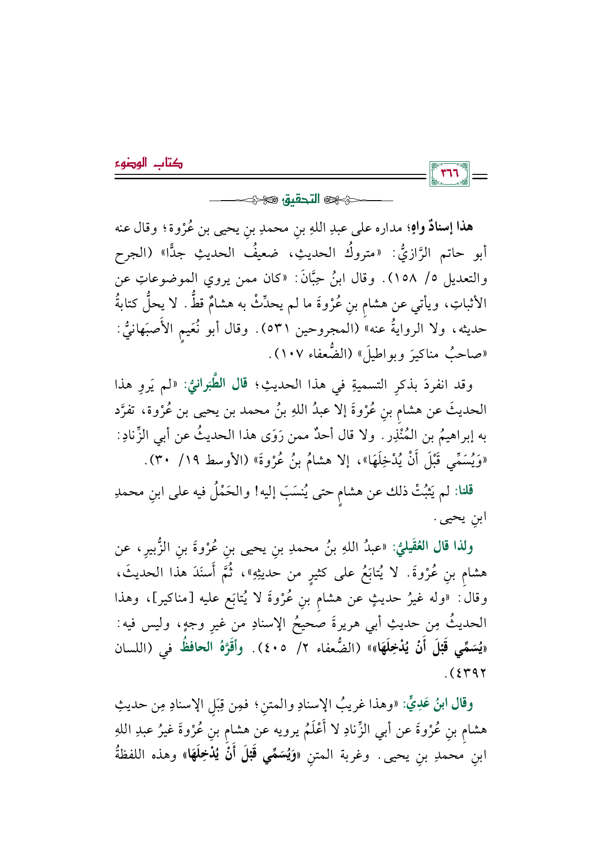 ولذا قال العُقَيليُّ: "عبدُ اللهِ بنُ محمدِ بنِ يحيى بنِ عُرْوةَ بنِ الزُّبيرِ، عن هشامِ بنِ عُرْوةَ. لا يُتابَعُ على كثيرٍ من حديثِهِ"، ثُمَّ أَسنَدَ هذا الحديثَ، وقال: "وله غيرُ حديثٍ عن هشامِ بنِ عُرْوةَ لا يُتابَع عليه [مناكير]، وهذا الحديثُ مِن حديثِ أبي هريرةَ صحيحُ الإسنادِ من غيرِ وجهٍ، وليس فيه: «يُسَمِّي قَبْلَ أَنْ يُدْخِلَهَا» " (الضُّعفاء ٢/ ٤٠٥). وأقَرَّهُ الحافظُ في (اللسان ٤٣٩٢).