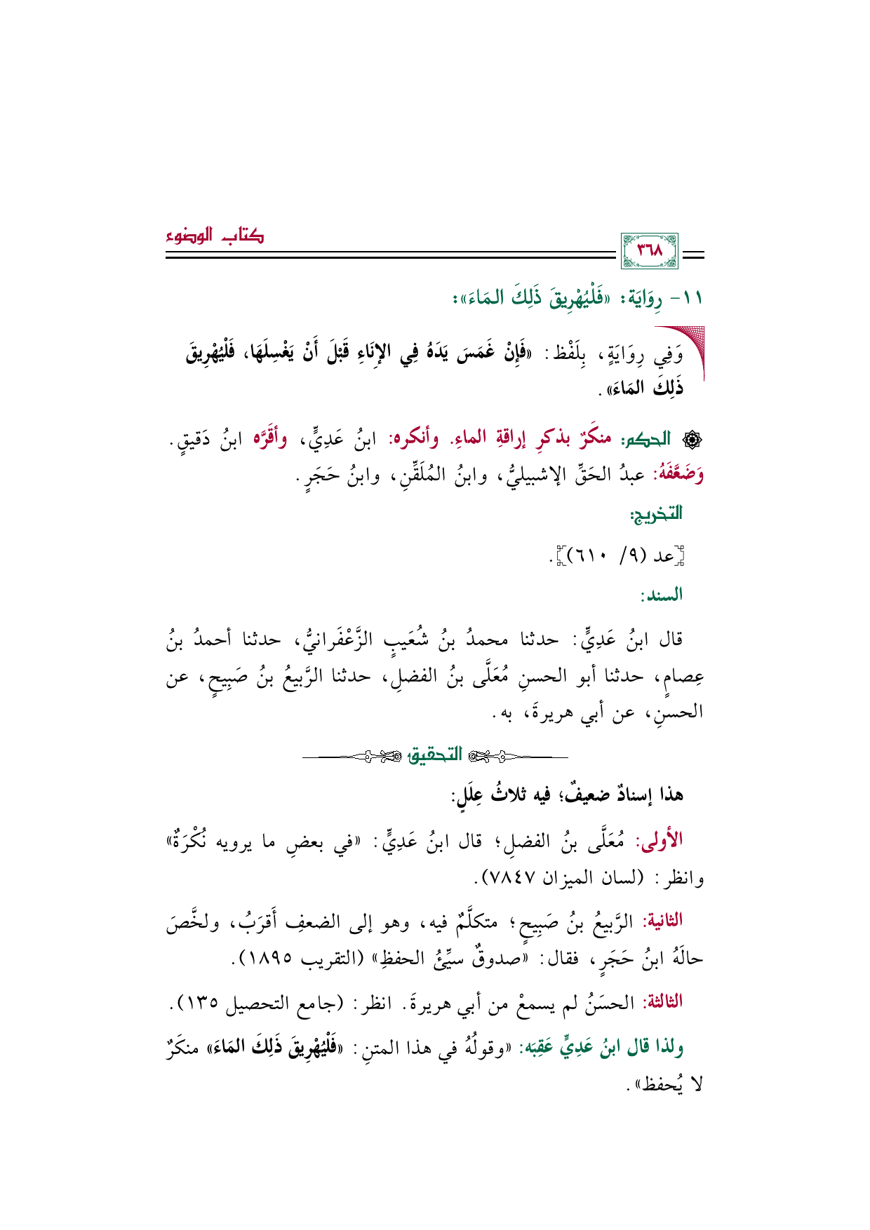 ولذا قال ابنُ عَدِيٍّ عَقِبَه: "وقولُهُ في هذا المتنِ: ((فَلْيُهْرِيقَ ذَلِكَ المَاءَ)) منكَرٌ لا يُحفظ".