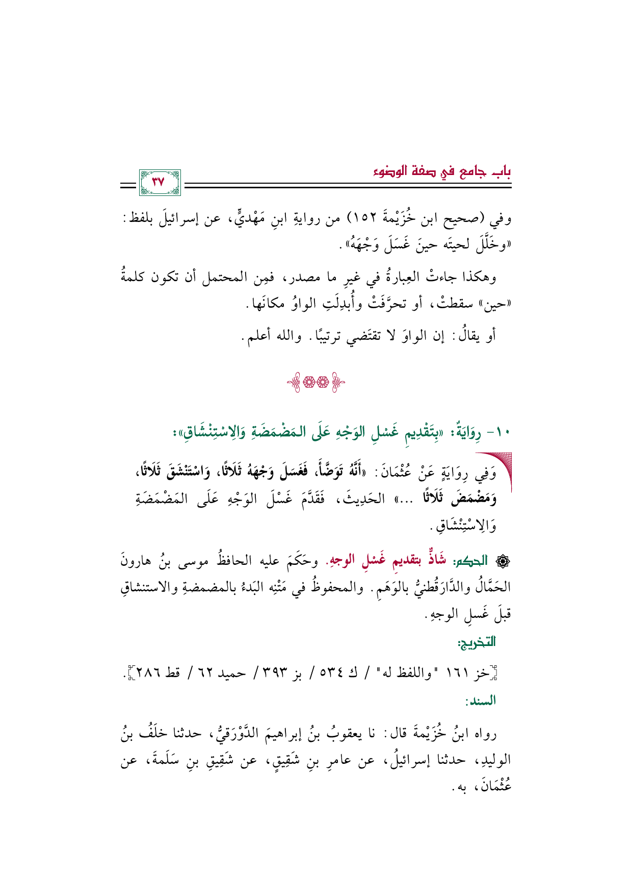 رواه ابنُ خُزَيْمةَ قال: نا يعقوبُ بنُ إبراهيمَ الدَّوْرَقيُّ، حدثنا خلَفُ بنُ الوليدِ، حدثنا إسرائيلُ، عن عامرِ بنِ شَقِيقٍ، عن شَقِيقِ بنِ سَلَمةَ، عن عُثْمَانَ، به.