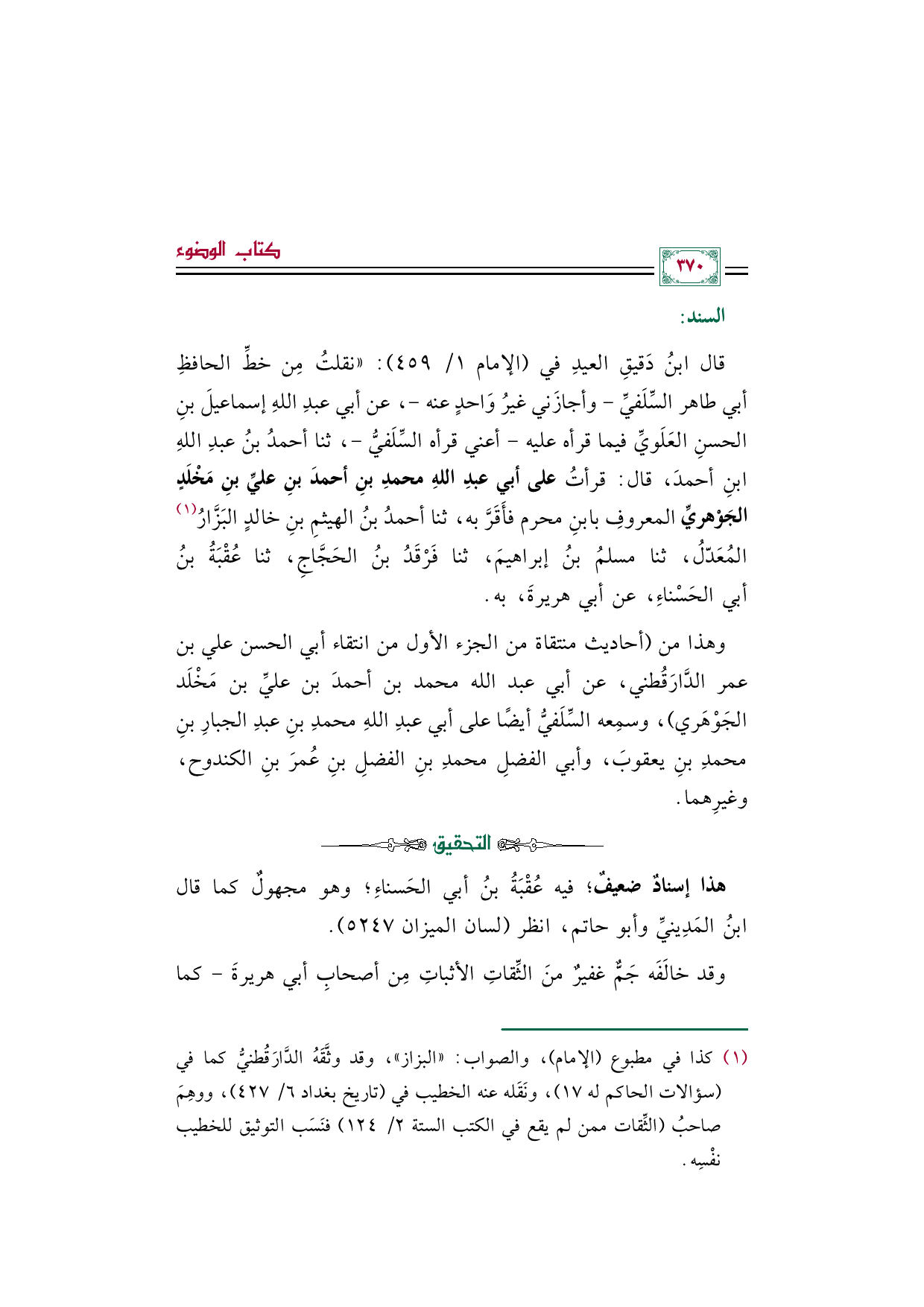 قال ابنُ دَقيقِ العيدِ في (الإمام ١/ ٤٥٩): "نقلتُ مِن خطِّ الحافظِ أبي طاهر السِّلَفيِّ -وأجازَني غيرُ وَاحدٍ عنه-، عن أبي عبدِ اللهِ إسماعيلَ بنِ الحسنِ العَلَويِّ فيما قرأه عليه -أعني قرأه السِّلَفيُّ-، ثنا أحمدُ بنُ عبدِ اللهِ بنِ أحمدَ، قال: قرأتُ على أبي عبدِ اللهِ محمدِ بنِ أحمدَ بنِ عليِّ بنِ مَخْلَدٍ الجَوْهريِّ المعروفِ بابنِ محرم فأَقَرَّ به، ثنا أحمدُ بنُ الهيثمِ بنِ خالدٍ البَزَّارُ (¬١) المُعَدّلُ، ثنا مسلمُ بنُ إبراهيمَ، ثنا فَرْقَدُ بنُ الحَجَّاجِ، ثنا عُقْبَةُ بنُ أبي الحَسْناءِ، عن أبي هريرةَ، به.