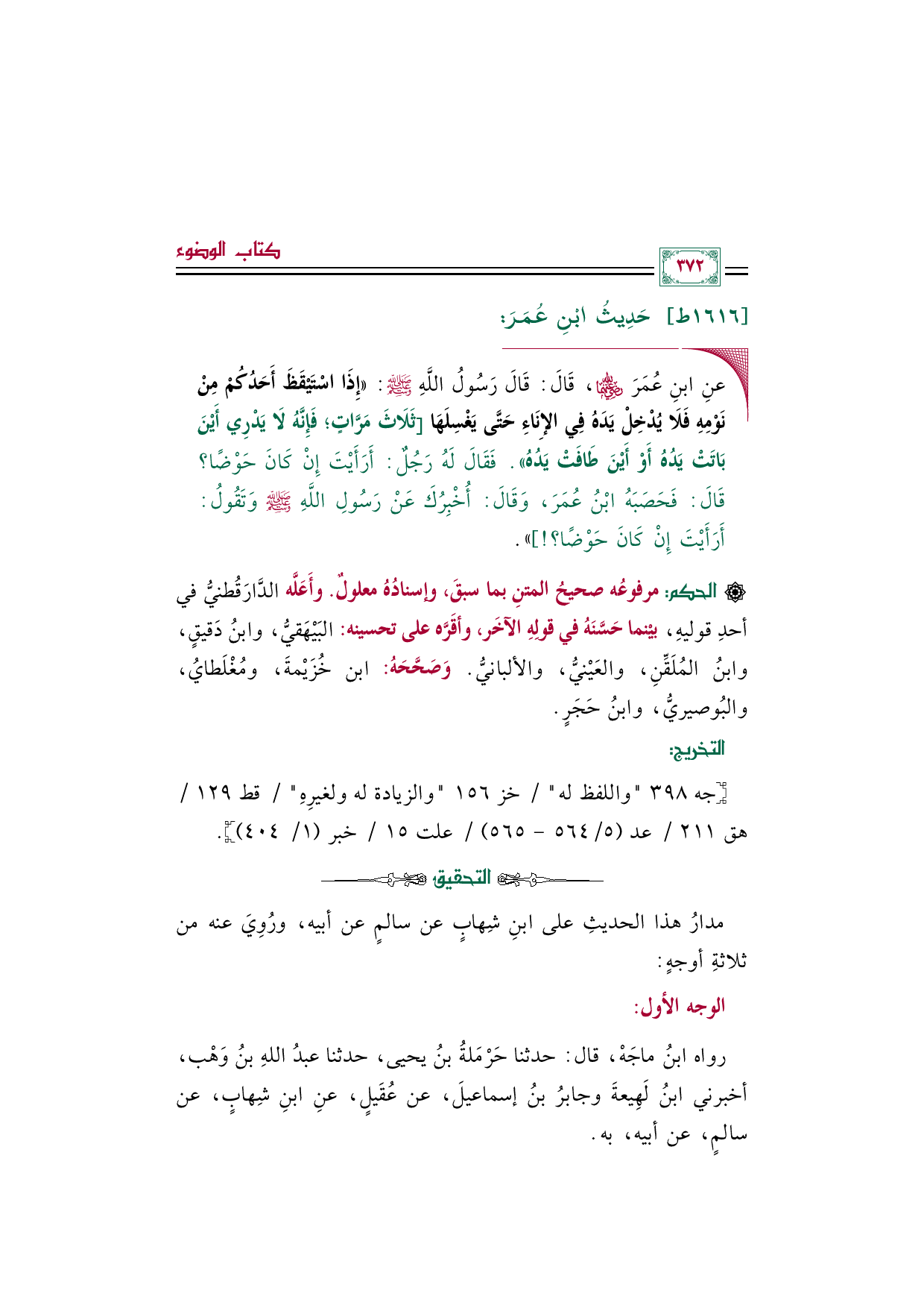◼ عنِ ابنِ عُمَرَ رضي الله عنهما، قَالَ: قَالَ رَسُولُ اللَّهِ صلى الله عليه وسلم: «إِذَا اسْتَيْقَظَ أَحَدُكُمْ مِنْ نَوْمِهِ فَلَا يُدْخِلْ يَدَهُ فِي الإِنَاءِ حَتَّى يَغْسِلَهَا [ثَلَاثَ مَرَّاتٍ؛ فَإِنَّهُ لَا يَدْرِي أَيْنَ بَاتَتْ يَدُهُ أَوْ أَيْنَ طَافَتْ يَدُهُ». فَقَالَ لَهُ رَجُلٌ: أَرَأَيْتَ إِنْ كَانَ حَوْضًا؟ قَالَ: فَحَصَبَهُ ابْنُ عُمَرَ، وَقَالَ: أُخْبِرُكَ عَنْ رَسُولِ اللَّهِ صلى الله عليه وسلم وَتَقُولُ: أَرَأَيْتَ إِنْ كَانَ حَوْضًا؟ ! ]».