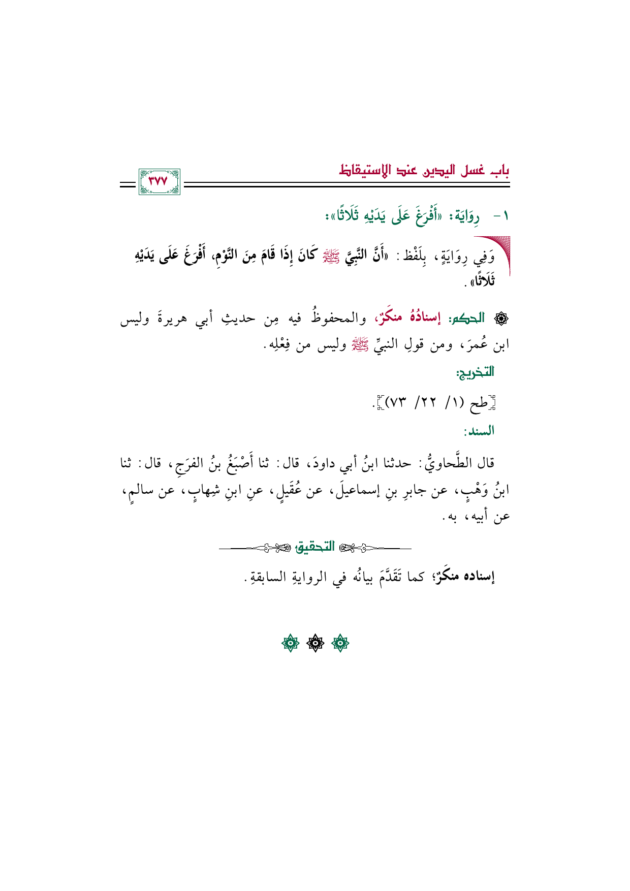 • وَفِي رِوَايَةٍ، بِلَفْظ: «أَنَّ النَّبِيَّ صلى الله عليه وسلم كَانَ إِذَا قَامَ مِنَ النَّوْمِ، أَفْرَغَ عَلَى يَدَيْهِ ثَلَاثًا».