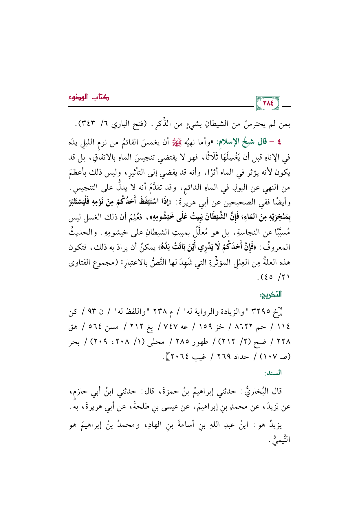 ٤ - قال شيخُ الإسلامِ: "وأما نهيُه صلى الله عليه وسلم أن يغمسَ القائمُ من نومِ الليلِ يدَه في الإناءِ قبل أن يَغْسِلَهَا ثَلَاثًا، فهو لا يقتضي تنجيسَ الماءِ بالاتفاقِ، بل قد يكون لأنه يؤثر في الماء أثرًا، وأنه قد يفضي إلى التأثيرِ، وليس ذلك بأعظمَ من النهي عن البولِ في الماءِ الدائمِ، وقد تقدَّمَ أنه لا يدلُّ على التنجيسِ. وأيضًا ففي الصحيحين عن أبي هريرةَ: ((إذَا اسْتَيْقَظَ أَحَدُكُمْ مِنْ نَوْمِهِ فَلْيَسْتَنْثِرْ بِمَنْخِرَيْهِ مِنَ المَاءِ؛ فَإِنَّ الشَّيْطَانَ يَبِيتُ عَلَى خَيْشُومِهِ))، فعُلِمَ أن ذلك الغسل ليس مُسبَّبًا عن النجاسةِ، بل هو مُعلَّلٌ بمبيتِ الشيطانِ على خيشومِهِ. والحديثُ المعروفُ: ((فَإِنَّ أَحَدَكُمْ لَا يَدْرِي أَيْنَ بَاتَتْ يَدُهُ)) يمكنُ أن يرادَ به ذلك، فتكون هذه العلةُ مِن العِللِ المؤثِّرةِ التي شَهِدَ لها النَّصُّ بالاعتبارِ" (مجموع الفتاوى ٢١/ ٤٥).