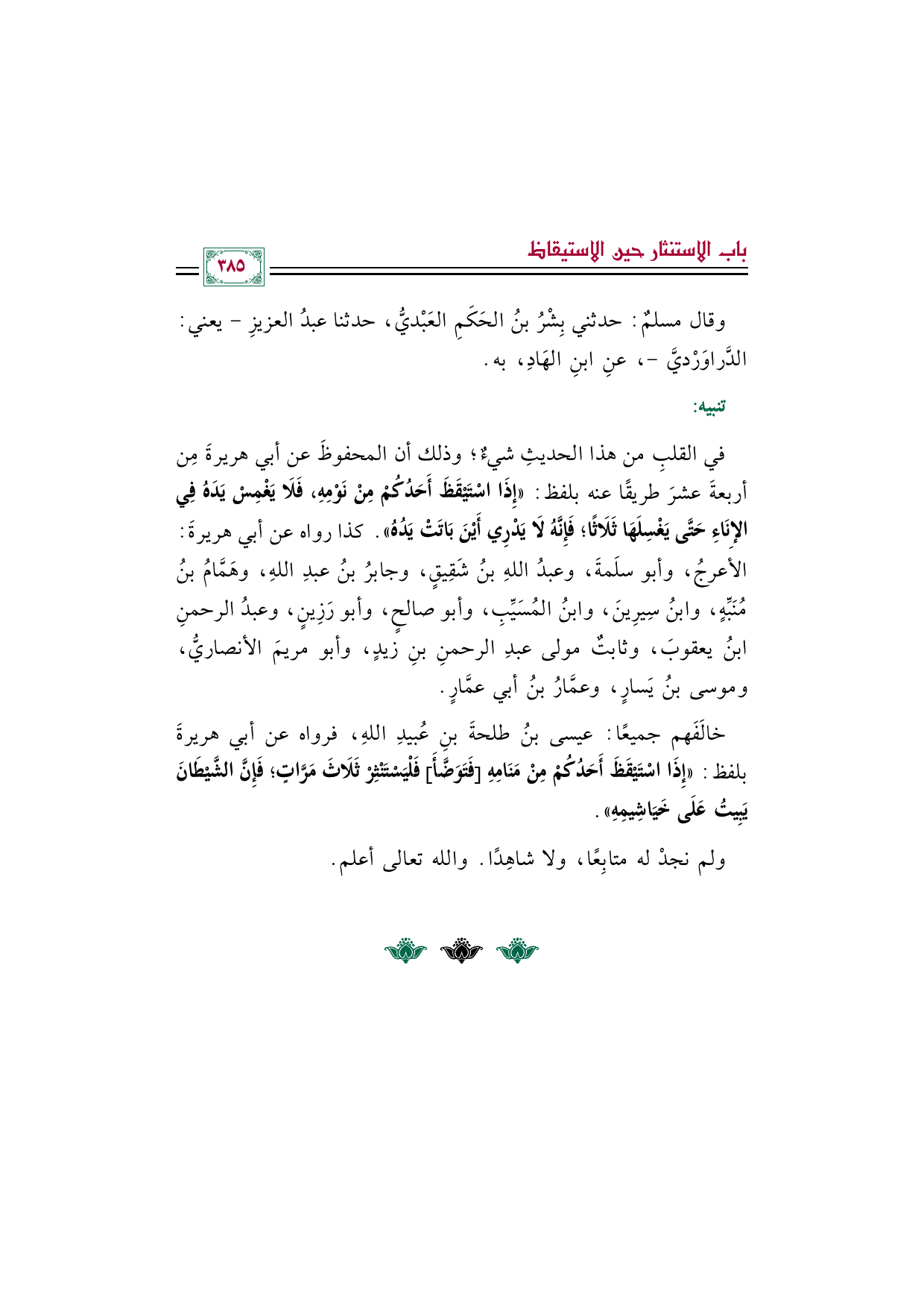 خالَفَهم جميعًا: عيسى بنُ طلحةَ بنِ عُبيدِ اللهِ، فرواه عن أبي هريرةَ بلفظ: «إِذَا اسْتَيْقَظَ أَحَدُكُمْ مِنْ مَنَامِهِ [فَتَوَضَّأَ] فَلْيَسْتَنْثِرْ ثَلَاثَ مَرَّاتٍ؛ فَإِنَّ الشَّيْطَانَ يَبِيتُ عَلَى خَيَاشِيمِهِ».