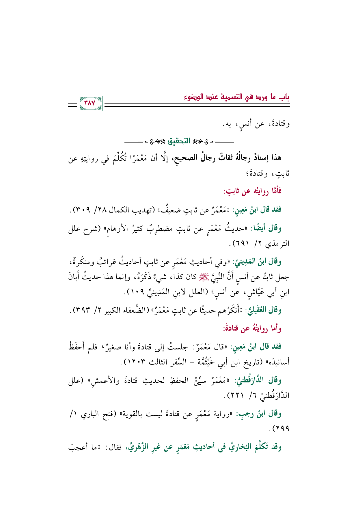 وقال ابنُ رجبٍ: "رواية مَعْمَرٍ عن قتادةَ ليست بالقوية" (فتح الباري ١/ ٢٩٩).