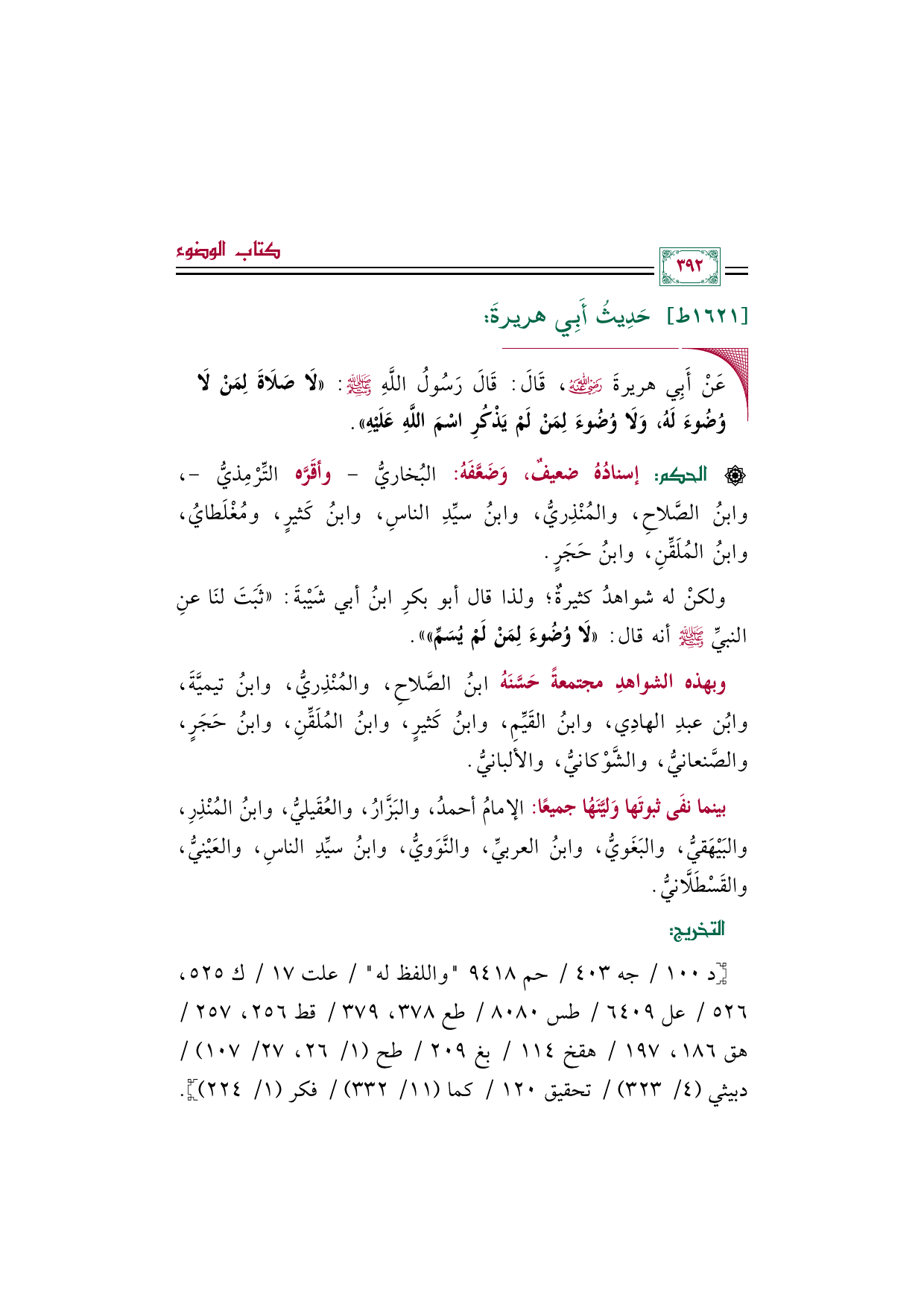 ◼ عَنْ أَبِي هريرةَ رضي الله عنه، قَالَ: قَالَ رَسُولُ اللَّهِ صلى الله عليه وسلم: «لَا صَلَاةَ لِمَنْ لَا وُضُوءَ لَهُ، وَلَا وُضُوءَ لِمَنْ لَمْ يَذْكُرِ اسْمَ اللَّهِ عَلَيْهِ».