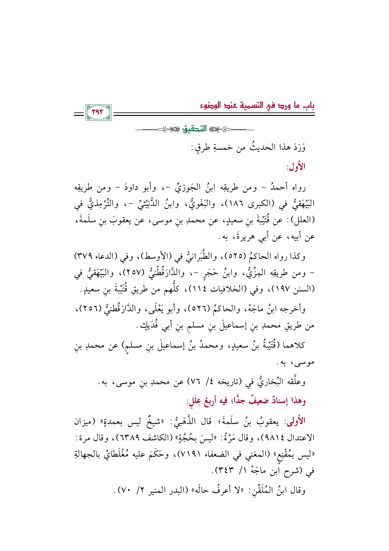 رواه أحمدُ -ومن طريقِه ابنُ الجَوزيِّ-، وأبو داودَ -ومن طريقِه البَيْهَقيُّ في (الكبرى ١٨٦)، والبَغَويُّ، وابنُ الدُّبَيْثيِّ-، والتِّرْمِذيُّ في (العلل): عن قُتَيْبةَ بنِ سعيدٍ، عن محمدِ بنِ موسى، عن يعقوبَ بنِ سلَمةَ، عن أبيه، عن أبي هريرةَ، به.