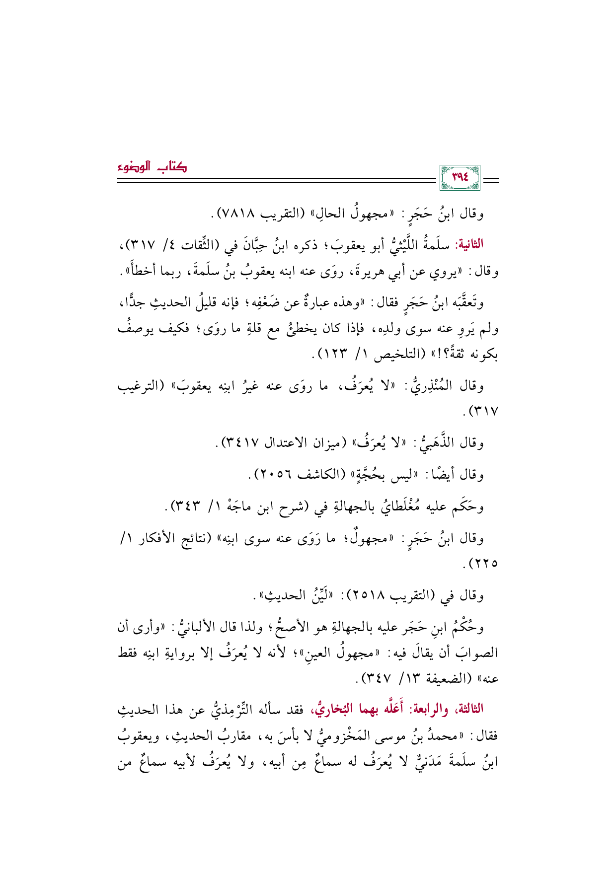 الثانية: سلَمةُ اللَّيْثيُّ أبو يعقوبَ؛ ذكره ابنُ حِبَّانَ في (الثِّقات ٤/ ٣١٧)، وقال: "يروي عن أبي هريرةَ، روَى عنه ابنه يعقوبُ بنُ سلَمةَ، ربما أخطأَ".