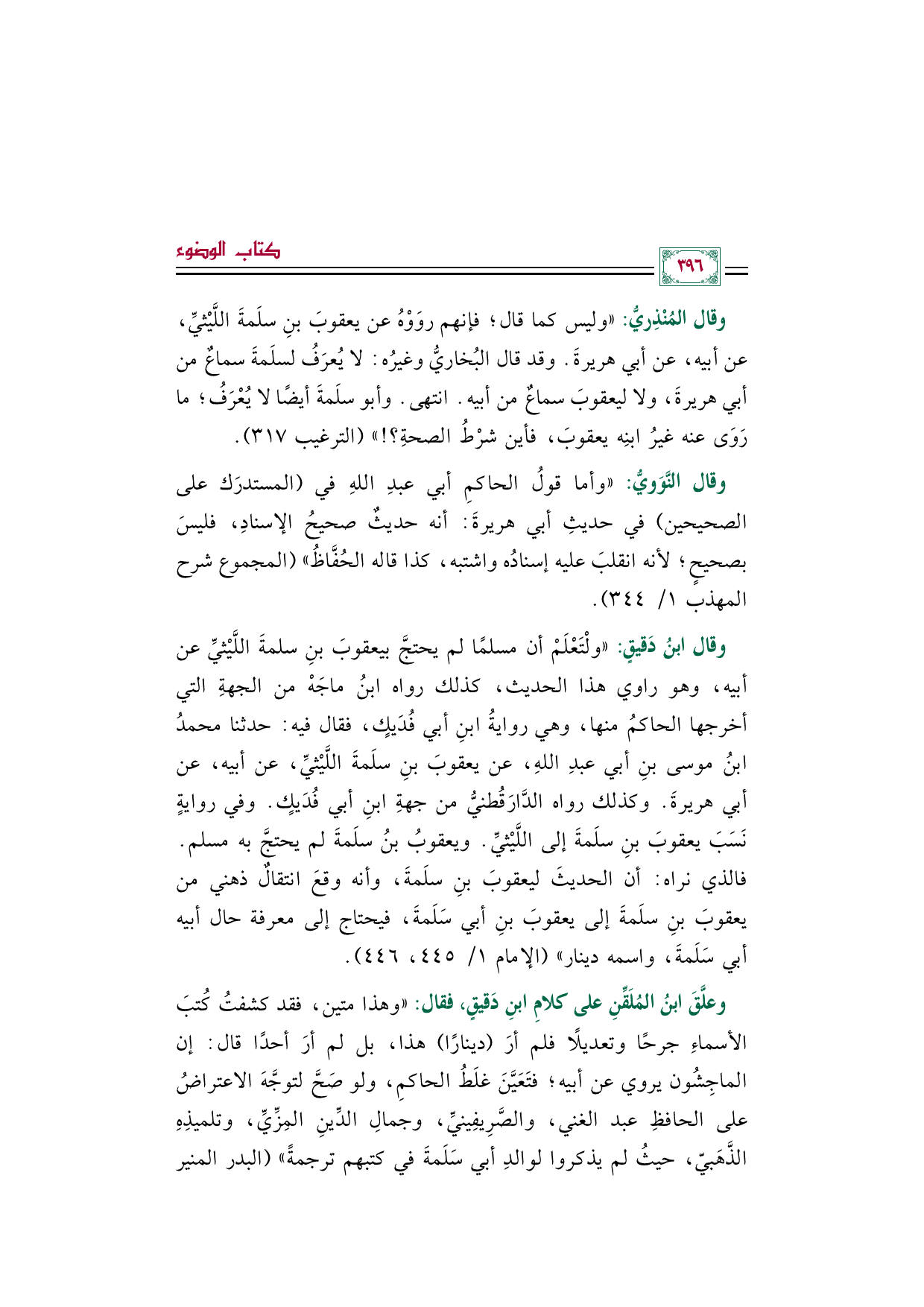 وقال ابنُ دَقيقٍ: "ولْتَعْلَمْ أن مسلمًا لم يحتجَّ بيعقوبَ بنِ سلمةَ اللَّيْثيِّ عن أبيه، وهو راوي هذا الحديث، كذلك رواه ابنُ ماجَهْ من الجهةِ التي أخرجها الحاكمُ منها، وهي روايةُ ابنِ أبي فُدَيكٍ، فقال فيه: حدثنا محمدُ بنُ موسى بنِ أبي عبدِ اللهِ، عن يعقوبَ بنِ سلَمةَ اللَّيْثيِّ، عن أبيه، عن أبي هريرةَ. وكذلك رواه الدَّارَقُطنيُّ من جهةِ ابنِ أبي فُدَيكٍ. وفي روايةٍ نَسَبَ يعقوبَ بنِ سلَمةَ إلى اللَّيْثيِّ. ويعقوبُ بنُ سلَمةَ لم يحتجَّ به مسلم. فالذي نراه: أن الحديثَ ليعقوبَ بنِ سلَمةَ، وأنه وقعَ انتقالٌ ذهني من يعقوبَ بنِ سلَمةَ إلى يعقوبَ بنِ أبي سَلَمةَ، فيحتاج إلى معرفة حال أبيه أبي سَلَمةَ، واسمه دينار" (الإمام ١/ ٤٤٥، ٤٤٦).