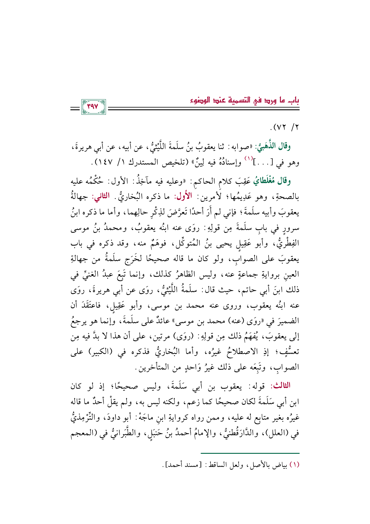 وقال مُغْلَطايُ عَقِبَ كلامِ الحاكمِ: "وعليه فيه مآخِذُ: الأول: حُكْمُه عليه بالصحةِ، وهو عَدِيمُها؛ لأمرين: الأول: ما ذكره البُخاريُّ. الثاني: جهالةُ يعقوبَ وأبيه سلَمةَ؛ فإني لم أَرَ أحدًا تَعرَّضَ لذِكْرِ حالِهما، وأما ما ذكره ابنُ سرورٍ في بابِ سلَمةَ مِن قولِهِ: روَى عنه ابنُه يعقوبُ، ومحمدُ بنُ موسى الفِطْريُّ، وأبو عَقِيلٍ يحيى بنُ المُتوكِّل، فوهَمٌ منه، وقد ذكره في باب يعقوبَ على الصوابِ، ولو كان ما قاله صحيحًا لخَرَج سلَمةُ من جهالةِ العينِ بروايةِ جماعةٍ عنه، وليس الظاهرُ كذلك، وإنما تَبِعَ عبدُ الغنيِّ في ذلك ابنَ أبي حاتم، حيث قال: سلَمةُ اللَّيْثيُّ، روَى عن أبي هريرةَ، روَى عنه ابنُه يعقوب، وروى عنه محمد بن موسى، وأبو عَقِيلٍ، فاعتَقَدَ أن الضميرَ في "روَى (عنه) محمد بن موسى" عائدٌ على سلَمةَ، وإنما هو يرجعُ إلى يعقوبَ، يُفهَمُ ذلك مِن قولِهِ: (روَى) مرتين، على أن هذا لا بدَّ فيه مِن تعسُّفٍ؛ إذِ الاصطلاحُ غيرُه، وأما البُخاريُّ فذكره في (الكبير) على الصوابِ، وتَبِعَه على ذلك غيرُ وَاحدٍ من المتأخرين.