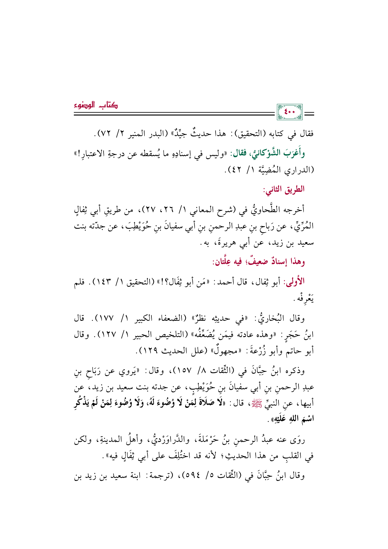 أخرجه الطَّحاويُّ في (شرح المعاني ١/ ٢٦، ٢٧)، من طريقِ أبي ثِفالٍ المُرِّيِّ، عن رَباحِ بنِ عبدِ الرحمنِ بنِ أبي سفيانَ بنِ حُوَيْطِبَ، عن جدّته بنت سعيد بن زيد، عن أبي هريرةَ، به.