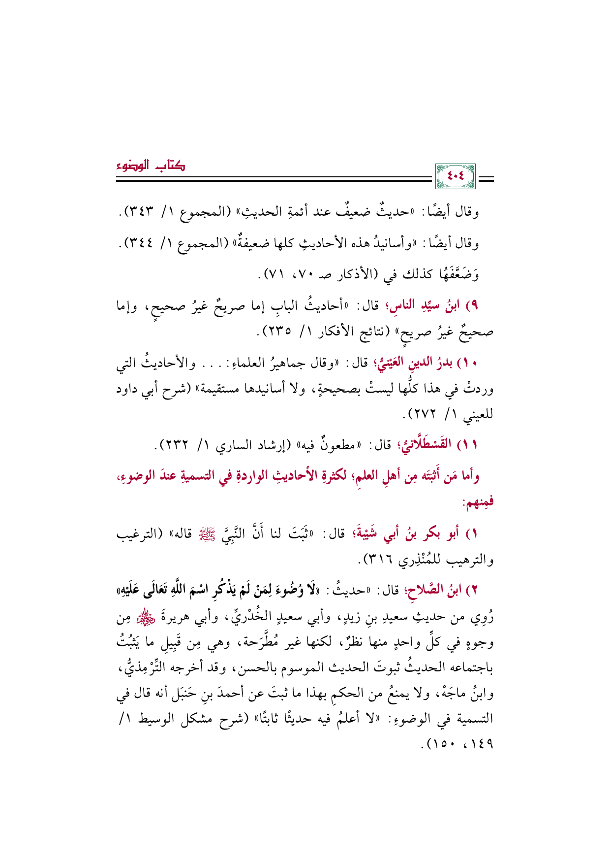 ١٠) بدرُ الدينِ العَيْنيُّ؛ قال: "وقال جماهيرُ العلماءِ: ... والأحاديثُ التي وردتْ في هذا كلُّها ليستْ بصحيحةٍ، ولا أسانيدها مستقيمة" (شرح أبي داود للعيني ١/ ٢٧٢).