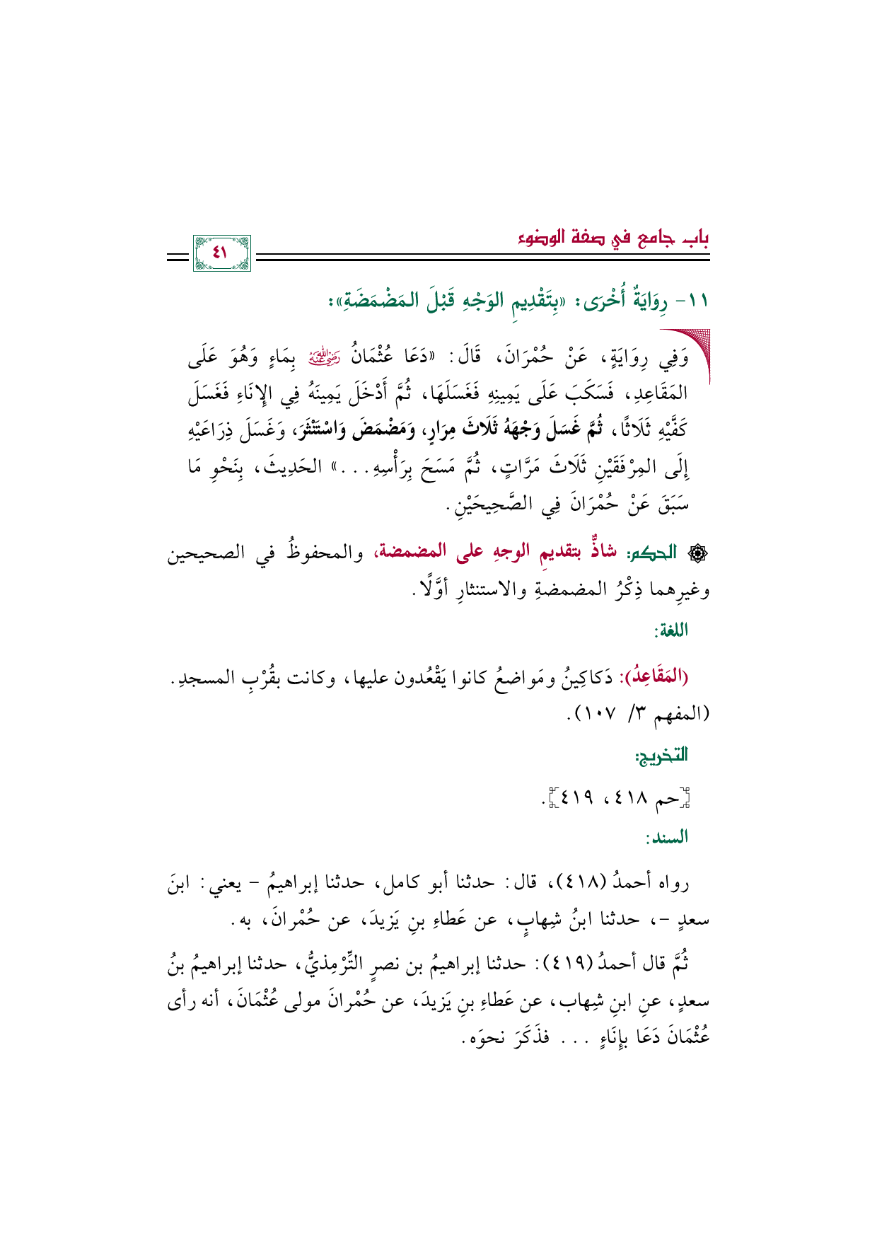 ثُمَّ قال أحمدُ (٤١٩): حدثنا إبراهيمُ بن نصرٍ التِّرْمِذيُّ، حدثنا إبراهيمُ بنُ سعدٍ، عنِ ابنِ شِهاب، عن عَطاءِ بنِ يَزيدَ، عن حُمْرانَ مولى عُثْمَانَ، أنه رأى عُثْمَانَ دَعَا بإِنَاءٍ ... فذَكَرَ نحوَه.