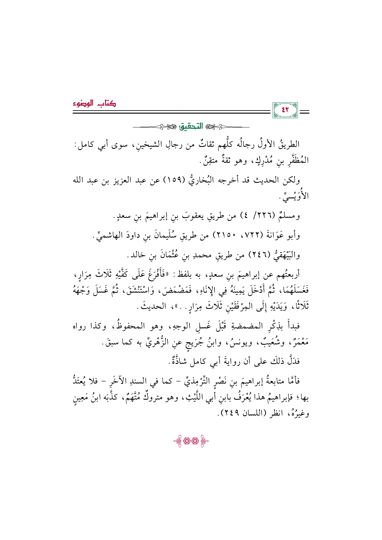أربعتُهم عن إبراهيمَ بنِ سعدٍ، به بلفظ: ((فَأَفْرَغَ عَلَى كَفَّيْهِ ثَلَاثَ مِرَارٍ، فَغَسَلَهُمَا، ثُمَّ أَدْخَلَ يَمِينَهُ فِي الإِنَاءِ، فَمَضْمَضَ، وَاسْتَنْشَقَ، ثُمَّ غَسَلَ وَجْهَهُ ثَلَاثًا، وَيَدَيْهِ إِلَى المِرْفَقَيْنِ ثَلَاثَ مِرَارٍ .. ))، الحديثَ.