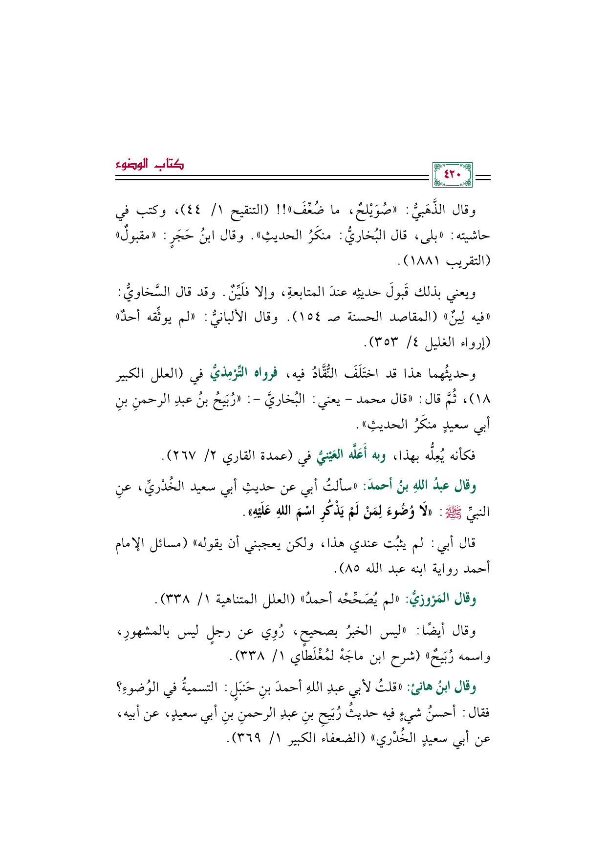 وقال ابنُ هانئ: "قلتُ لأبي عبدِ اللهِ أحمدَ بنِ حَنبَلٍ: التسميةُ في الوُضوءِ؟ فقال: أحسنُ شيءٍ فيه حديثُ رُبَيحِ بنِ عبدِ الرحمنِ بنِ أبي سعيدٍ، عن أبيه، عن أبي سعيدٍ الخُدْري" (الضعفاء الكبير ١/ ٣٦٩).