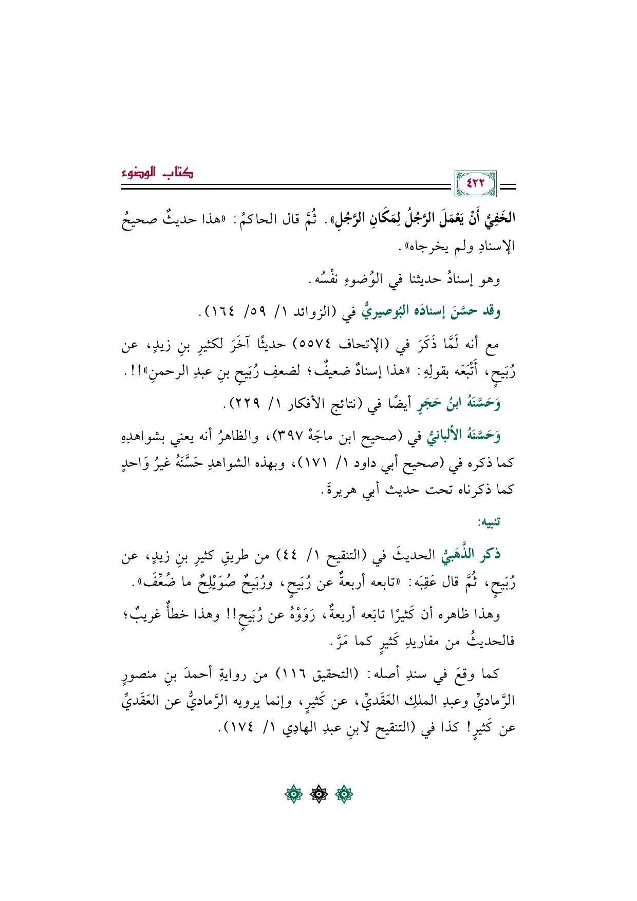 ذكر الذَّهَبيُّ الحديثَ في (التنقيح ١/ ٤٤) من طريقِ كثيرِ بنِ زيدٍ، عن رُبَيحٍ، ثُمَّ قال عَقِبَه: "تابعه أربعةٌ عن رُبَيحٍ، ورُبَيحٌ صُوَيْلِحٌ ما ضُعِّفَ".