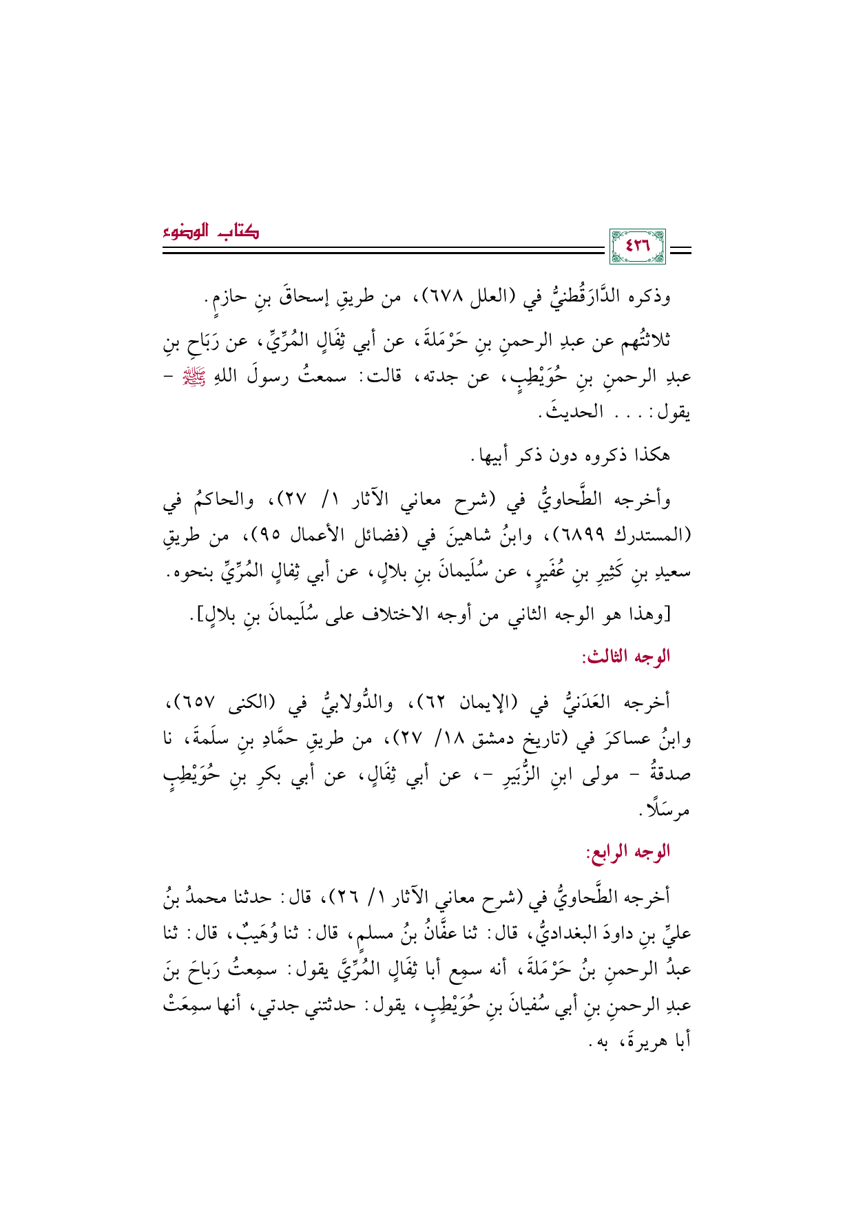 أخرجه الطَّحاويُّ في (شرح معاني الآثار ١/ ٢٦)، قال: حدثنا محمدُ بنُ عليِّ بنِ داودَ البغداديُّ، قال: ثنا عفَّانُ بنُ مسلمٍ، قال: ثنا وُهَيبٌ، قال: ثنا عبدُ الرحمنِ بنُ حَرْمَلةَ، أنه سمِع أبا ثِفَالٍ المُرِّيَّ يقول: سمِعتُ رَباحَ بنَ عبدِ الرحمنِ بنِ أبي سُفيانَ بنِ حُوَيْطِبٍ، يقول: حدثتني جدتي، أنها سمِعَتْ أبا هريرةَ، به.