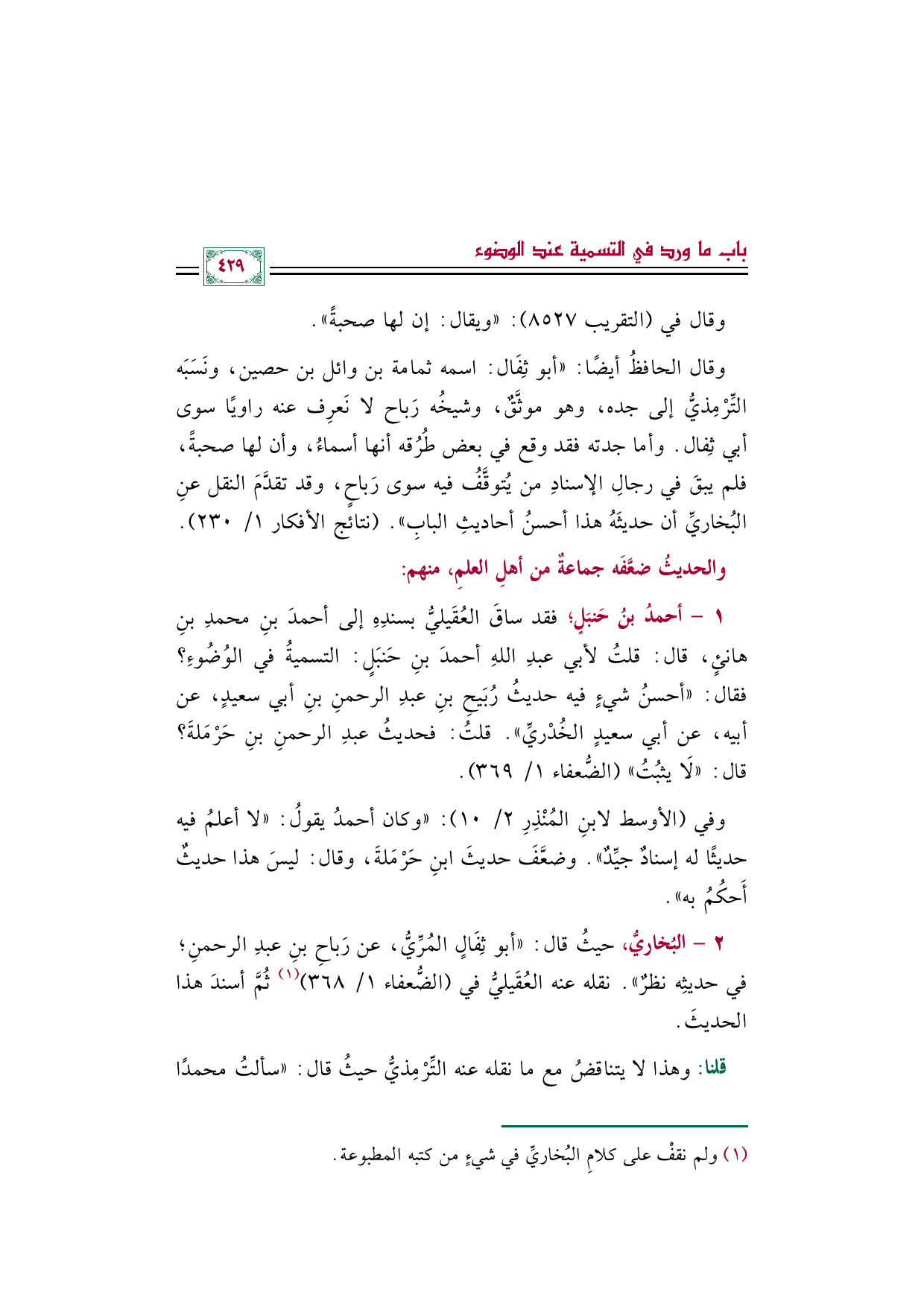 وقال الحافظُ أيضًا: "أبو ثِفَال: اسمه ثمامة بن وائل بن حصين، ونَسَبَه التِّرْمِذيُّ إلى جده، وهو موثَّقٌ، وشيخُه رَباح لا نَعرِف عنه راويًا سوى أبي ثِفال. وأما جدته فقد وقع في بعض طُرُقه أنها أسماءُ، وأن لها صحبةً، فلم يبقَ في رجالِ الإسنادِ من يُتوقَّفُ فيه سوى رَباحٍ، وقد تقدَّمَ النقل عنِ البُخاريِّ أن حديثَهُ هذا أحسنُ أحاديثِ البابِ". (نتائج الأفكار ١/ ٢٣٠).