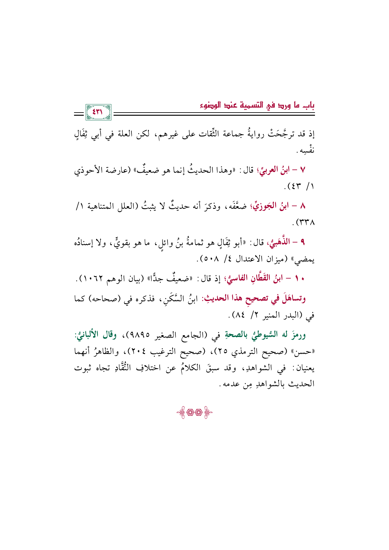 ٩ - الذَّهَبيُّ، قال: "أبو ثِفَالٍ هو ثمامةُ بنُ وائلٍ، ما هو بقويٍّ، ولا إسنادُه يمضي" (ميزان الاعتدال ٤/ ٥٠٨).