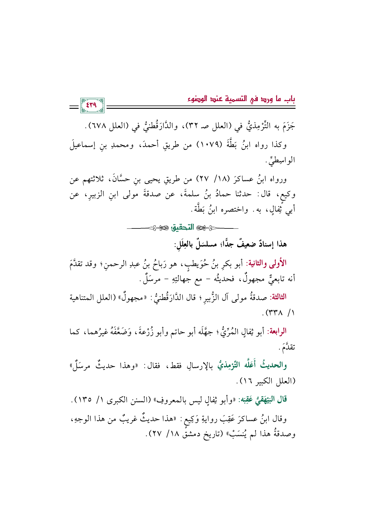 الثالثة: صدقةُ مولى آل الزُّبيرِ؛ قال الدَّارَقُطنيُّ: "مجهولٌ" (العلل المتناهية ١/ ٣٣٨).