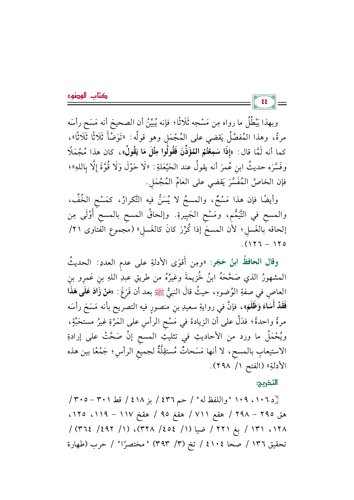 وبهذا يَبْطُلُ ما رواه مِن مَسْحِه ثَلَاثًا؛ فإنه يُبيِّنُ أن الصحيحَ أنه مَسَح رأسَه مرةً، وهذا المُفصَّلُ يَقضي على المُجْمَلِ وهو قولُه: ((تَوَضَّأَ ثَلَاثًا ثَلَاثًا))، كما أنه لَمَّا قال: ((إِذَا سَمِعْتُمُ المُؤَذِّنَ فَقُولُوا مِثْلَ مَا يَقُولُ))، كان هذا مُجْمَلًا وفَسَّرَه حديثُ ابنِ عُمرَ أنه يقولُ عند الحَيْعَلةِ: ((لَا حَوْلَ وَلَا قُوَّةَ إِلَّا بِاللهِ))؛ فإن الخاصَّ المُفَسَّرَ يَقضي على العامِّ المُجْمَلِ.