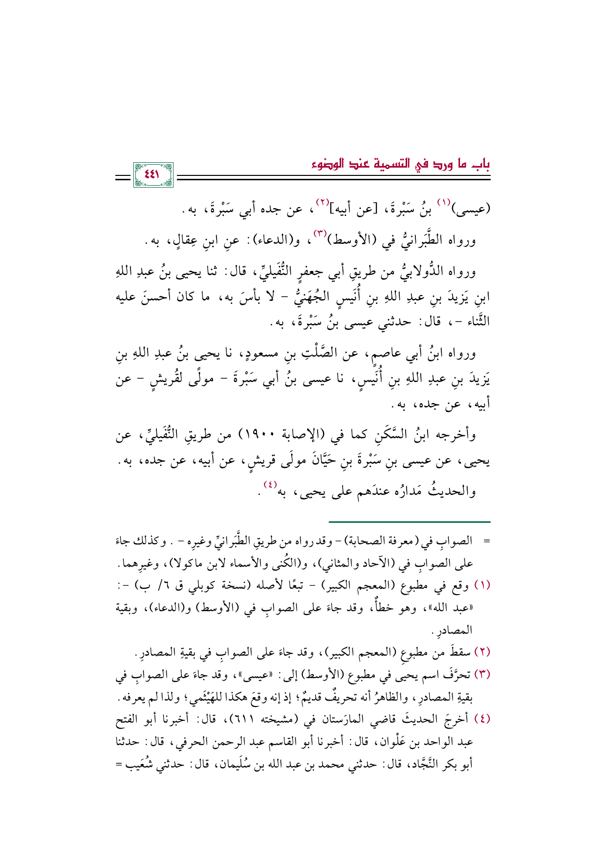 (¬٤) أخرجَ الحديثَ قاضي المارَستان في (مشيخته ٦١١)، قال: أخبرنا أبو الفتح عبد الواحد بن عَلْوان، قال: أخبرنا أبو القاسم عبد الرحمن الحرفي، قال: حدثنا أبو بكر النَّجَّاد، قال: حدثني محمد بن عبد الله بن سُلَيمان، قال: حدثني شُعَيب بن سلَمةَ الأنصاريُّ، قال حدثنا يحيى بن عبد الله بن يَزيدَ بن عبد الله بن أُنَيس، قال: حدثني عيسى بن سَبْرة، عن أبيه، عن جده أبي سَبرةَ ... فذكر الحديث.